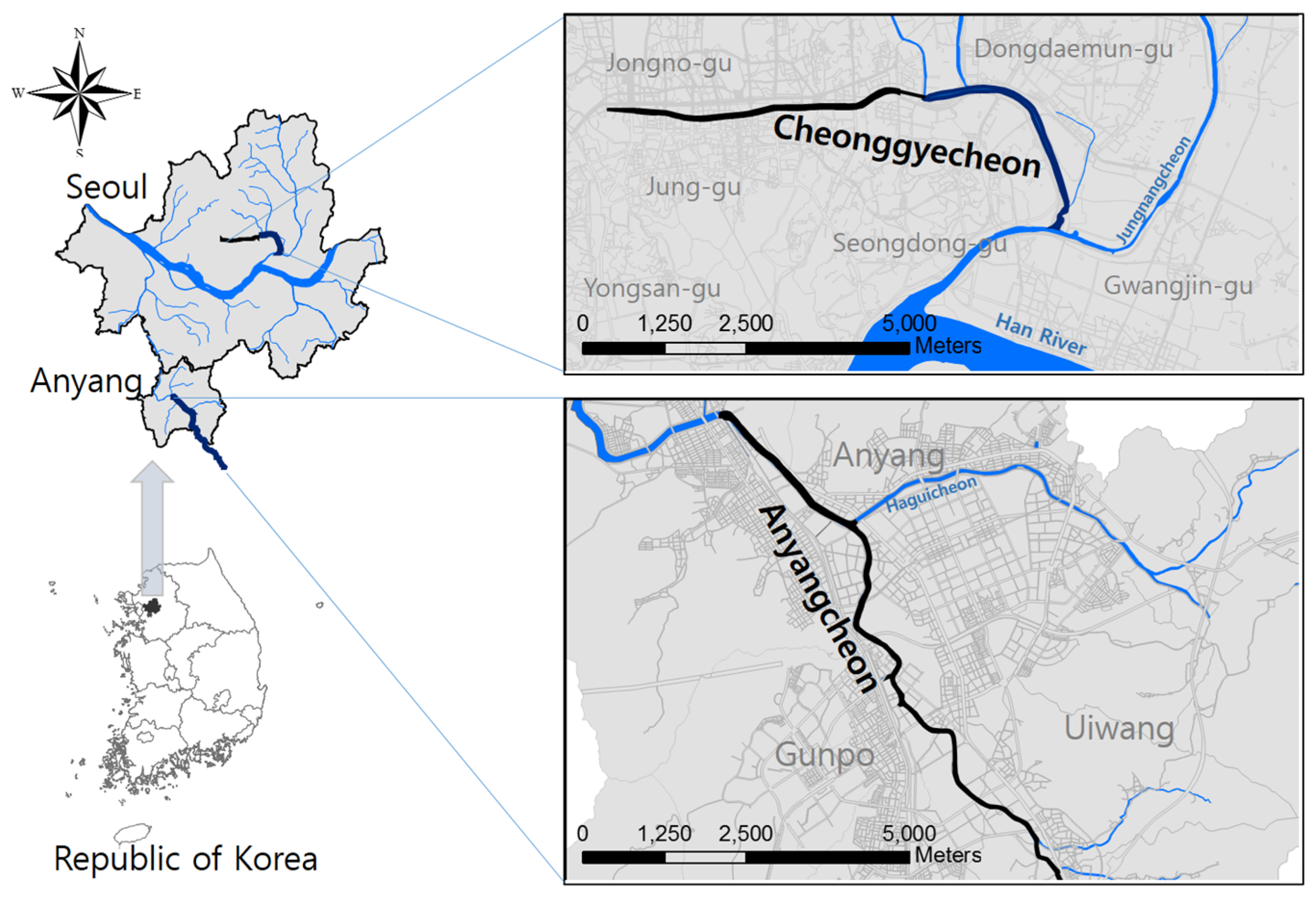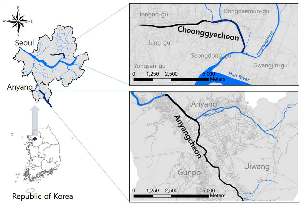 In contrast to the Cheonggyecheon, Anyangcheon is an urban river running through four towns in Seoul and four cities Kyunggi Province. Approximately 3.87 million people reside in this watershed, with a population density of 13,500 persons per km2. Primary land cover types within the watershed (as of 2000) comprise 43.03% urban area, 39.79% forest area, and 12.95% agricultural area [30]. Similar to most of the urban watersheds in Korea, the environmental quality of Anyangcheon, including the quantity and quality of the water, had degraded due to the negative externalities of rapid industrialization in Korea and resulted in devastating flood damage, stream depletion, and even the loss of biodiversity [31]. Due to these respects, the Seoul Metropolitan Government and the Anyang Municipal Government initiated the “Anyangcheon Ecological River Restoration Masterplan (2001–2013)” focused on ameliorating water quality, increasing water quantity, and restoring the ecosystem. The initial budget of this project was 49.6 billion won (approximately US$36.1 million). Unlike Cheonggyecheon, implementing this project resulted not only in increasing the number of biodiversity in ichthyofaunal, avifauna, and flora, but also in ameliorating the environment of the surrounding residential area by eliminating waste odor and providing better recreational facilities (e.g., a riverside bike road and waterfront areas). Kong, Park, and Yoo [32] concluded that the aggregated value of water quality improvement in this watershed can be estimated as approximately 83.0 to 109.7 billion won per year, which is approximately US$60.4 million to US$79.9 million. Figure 1 shows the location of the study areas.