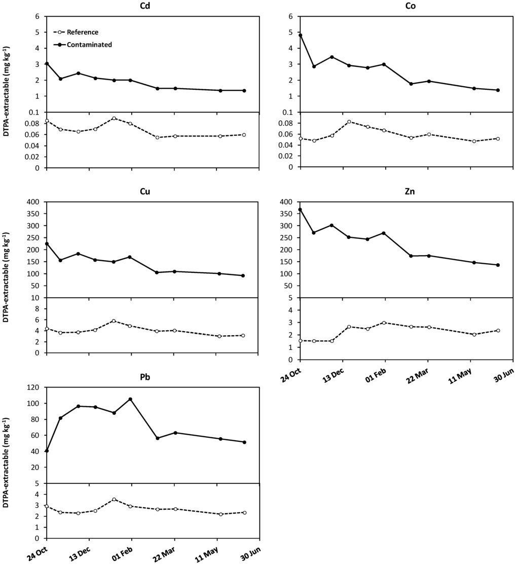 Dynamics of DTPA extractable metals (mg·kg−1 DW, n = 2) in contaminated and reference soils (both uncultivated). Note different scales among treatments and metals.