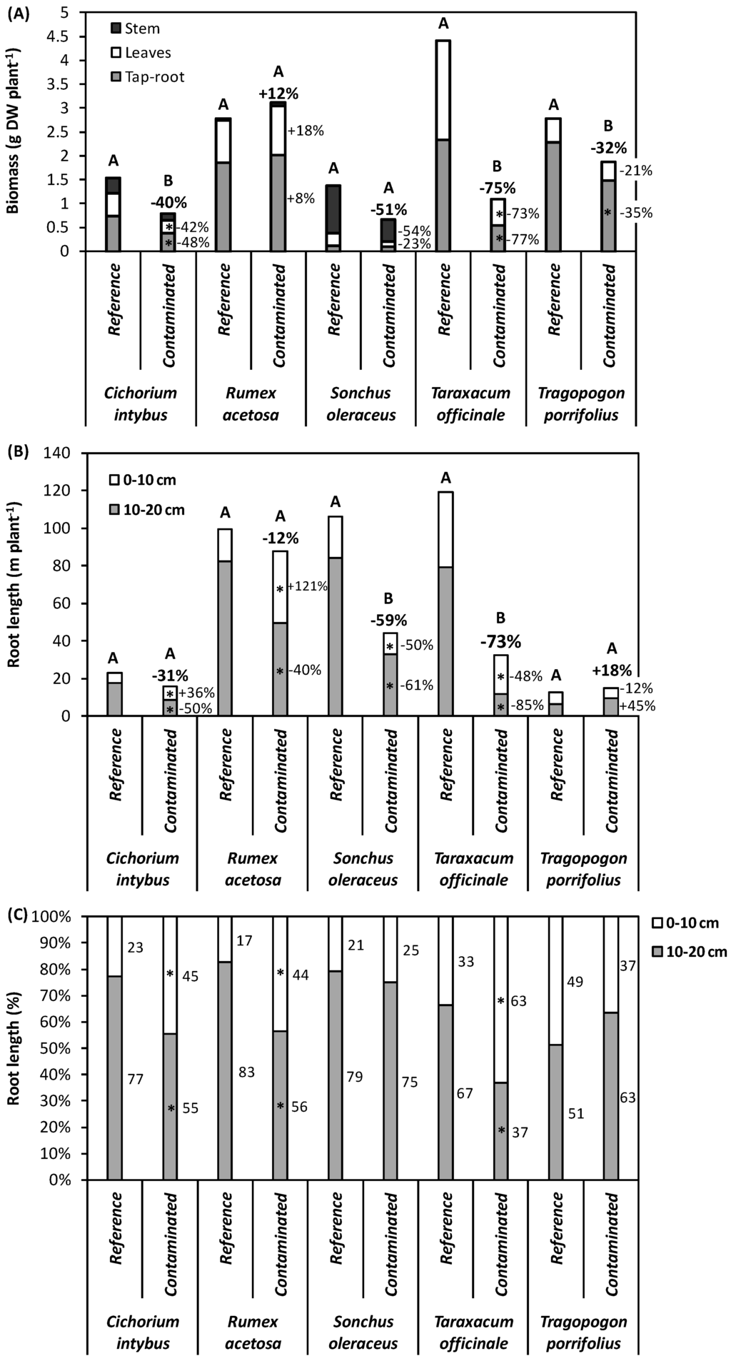 Biomass (A), root length (B) and distribution (C) in species grown in contaminated vs. reference soil (n = 3) in pot trial. Capital letters: differences among soils within same species for plant biomass and root length (% variation with respect to reference soil). *: statistically significant differences between soils within same species and plant compartment or soil layer.