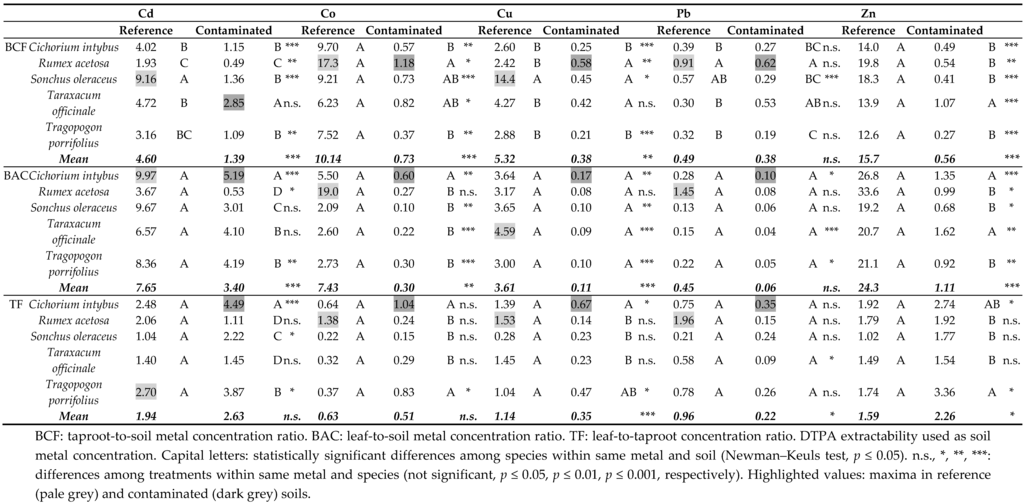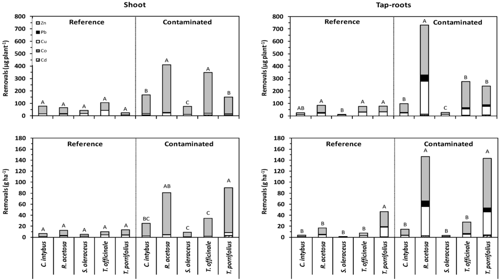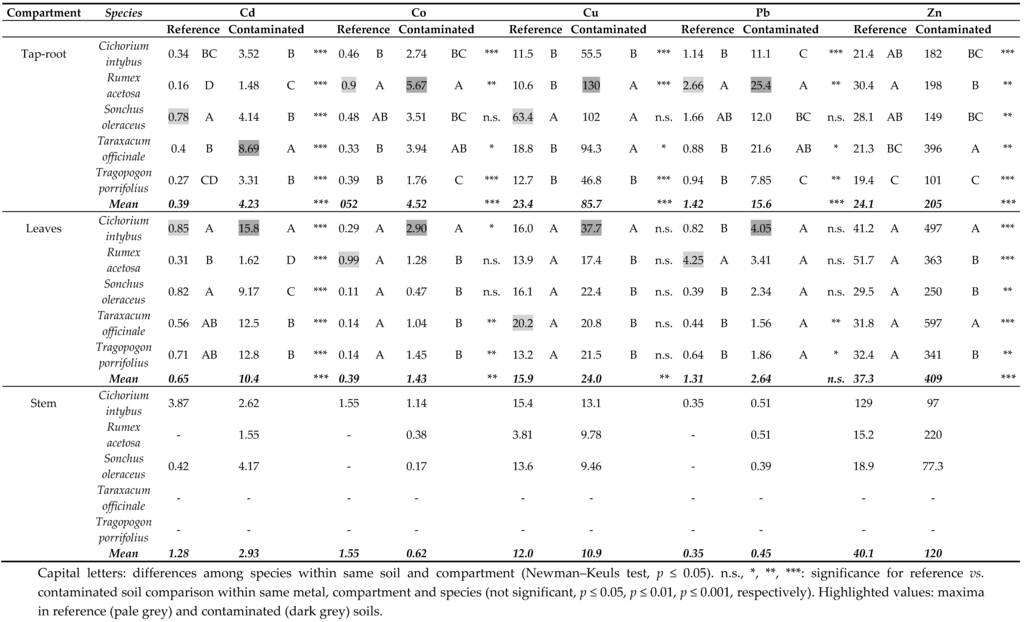 Phytoremediation of metal-contaminated sites may consider two strategies, the use of hyperaccumulator species, which generally yield small biomasses rich in one or a few contaminants, and high-yielding species (including crops), with low or medium contaminant concentrations. As the research community is constantly searching for efficient new species for particular environments characterised by multiple metal contamination, in this study five polyannual tap-rooted alimurgic species with the potential to combine both phytoextraction and medium-term metal stabilisation within roots were examined. Apart from T. porrifolius, a biennial wild flower native to the Mediterranean region, the behaviour of which has not yet been studied, the literature provides interesting reports for the other species. The cosmopolitan T. officinale is recognised as an indicator of Cd, Pb, Cu and Zn [24,25,26], and C. intybus is already known for its interesting Zn and Cu above-ground accumulations, up to ~150 and ~20 mg·kg−1, respectively [18,27,28,29]. The possible high leaf Cd (~50 mg·kg−1·DW) also suggests its use as a Cd indicator, and the extremely high Pb (>1.1 g·kg−1·DW) allows it to be classified as a Pb hyperaccumulator [30]. S. oleraceus is a common weed in pastures, disturbed areas and contaminated roadsides, being tolerant to high soil Pb [31] and capable of accumulating above-ground up to 1.6 g·Pb·kg−1 and 2.5 g·Zn·kg−1 in degraded environments [17]. R. acetosa is a pseudo-metallophyte colonising contaminated sites [32,33,34], and, in mining areas, some accessions can achieve Zn removals comparable with those of hyperaccumulator species [16].