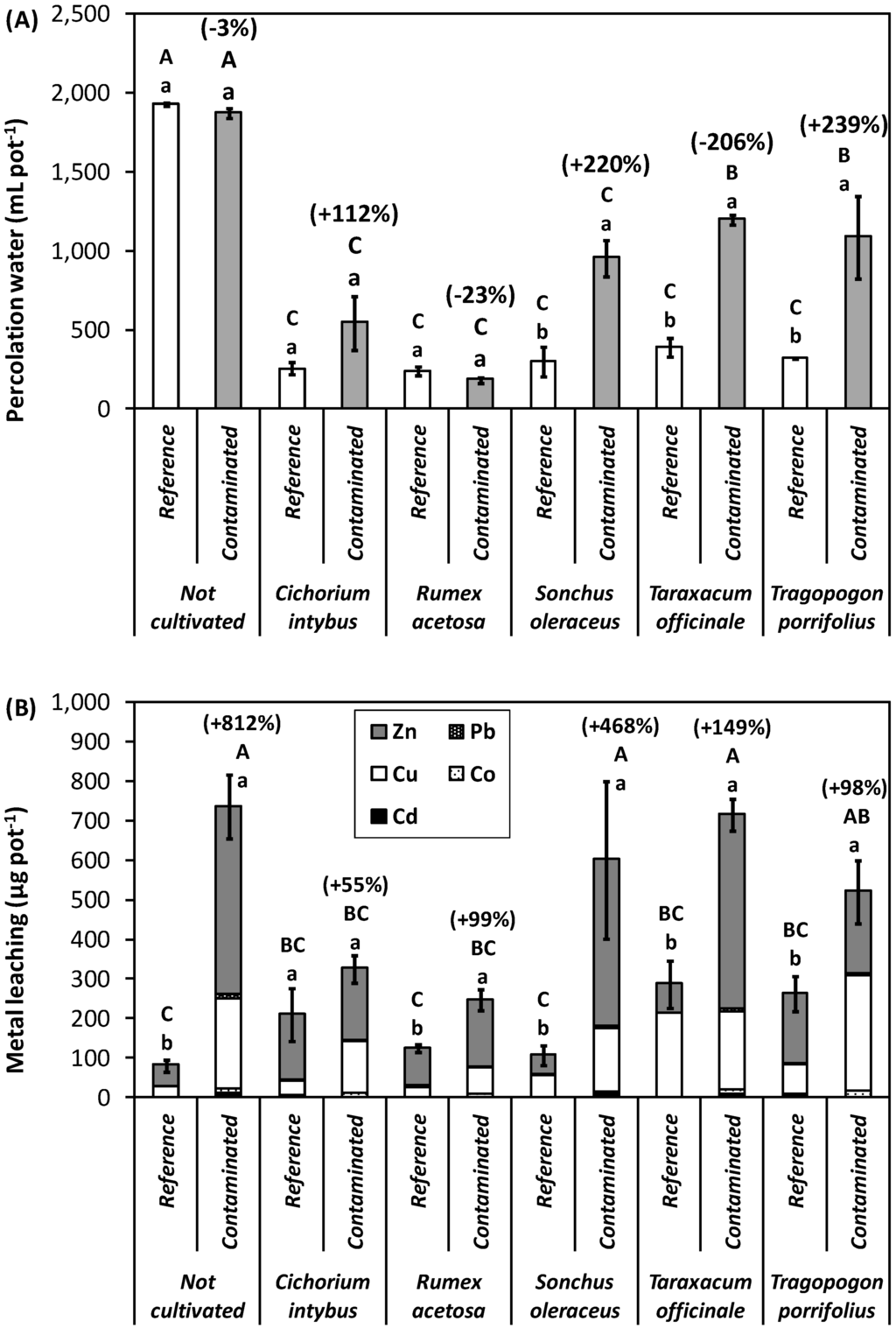Water percolation volumes (± s.e., n = 3) (A) and overall metal leaching (± s.e., n = 3) (B) in pot trial. In brackets: percentage of variation with respect to reference soil. Capital letters: significance for multiple comparisons. Small letters: differences between soils within same species (Newman–Keuls test, p ≤ 0.05).