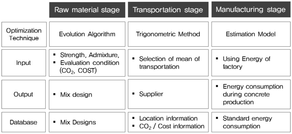 Because the CO2 emissions created by the Korean construction industry account for 40% of the nation’s total, it is essential to reduce the amount of CO2 generated by construction activities if Korea is to attain its ambitious greenhouse gas reduction goal [1]. Concrete is known to emit particularly high amounts of environmentally damaging waste over its life cycle of production, construction, maintenance and, eventually, demolition. The industry is well aware of this; the amount of CO2 emissions produced is specified in a ready-mixed concrete (RMC) report that is provided whenever concrete is sold commercially in Korea. Although this has led to many studies addressing the quantitative evaluation and reduction of the environmental effects of concrete, little research has considered the development of optimization systems that would enable concrete production companies to reduce the CO2 emissions associated with concrete. This study therefore focused on developing an optimization system, dubbed the concrete life cycle assessment system (CLAS), to recommend options to help minimize CO2 emissions and/or the costs incurred at every stage of the concrete production process.