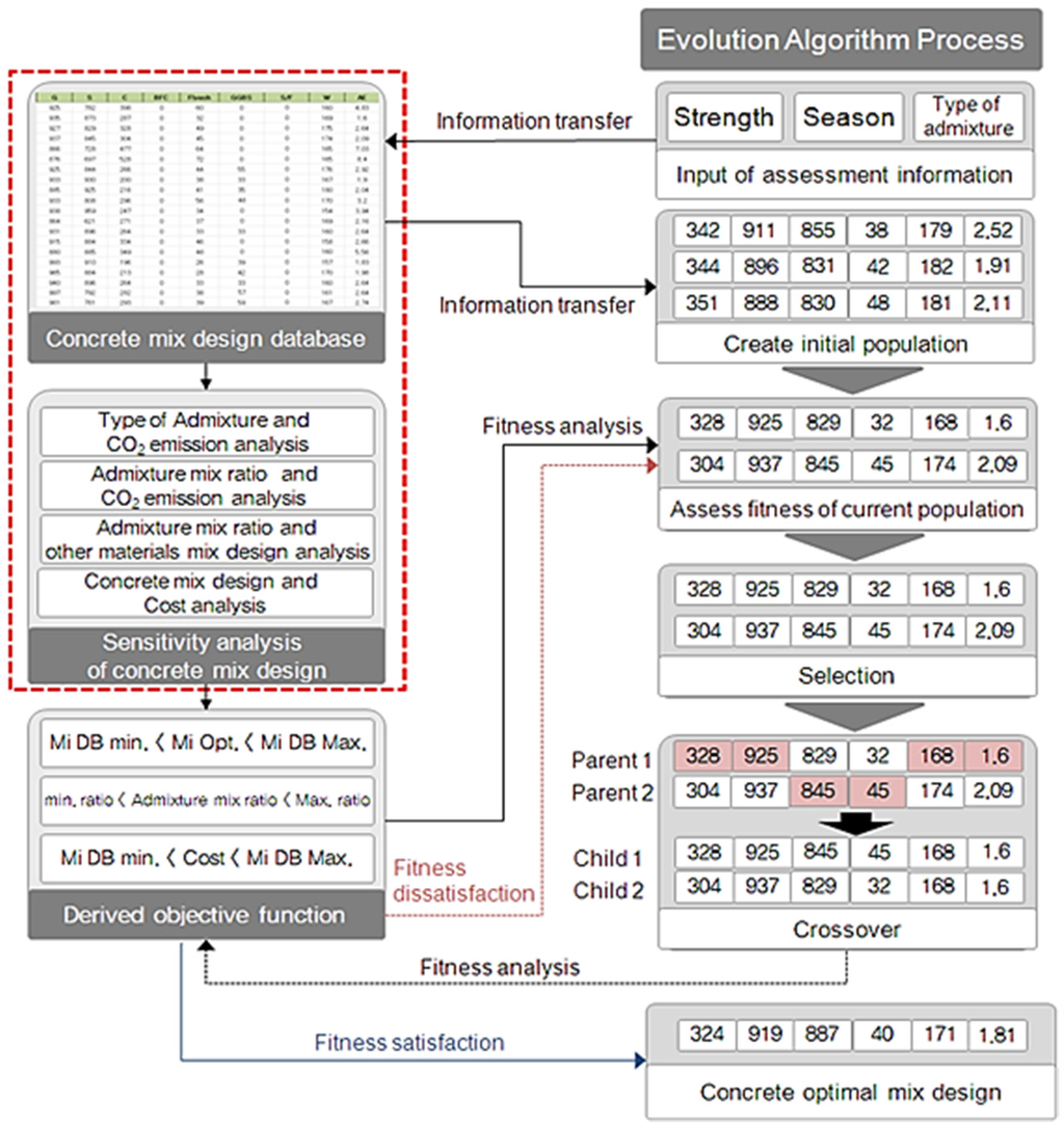 Figure 3 shows the process of deriving the concrete mix design using the evolution algorithm. After information regarding the concrete strength, admixture types, and mix ratio has been entered, it is immediately transferred to the established database of mix designs, where mix designs that are consistent with the input data (for example, strength, admixture type, and mix ratio) are identified and established as the initial group. These processes are performed to generate the initial group needed to apply the evolution algorithm [17].