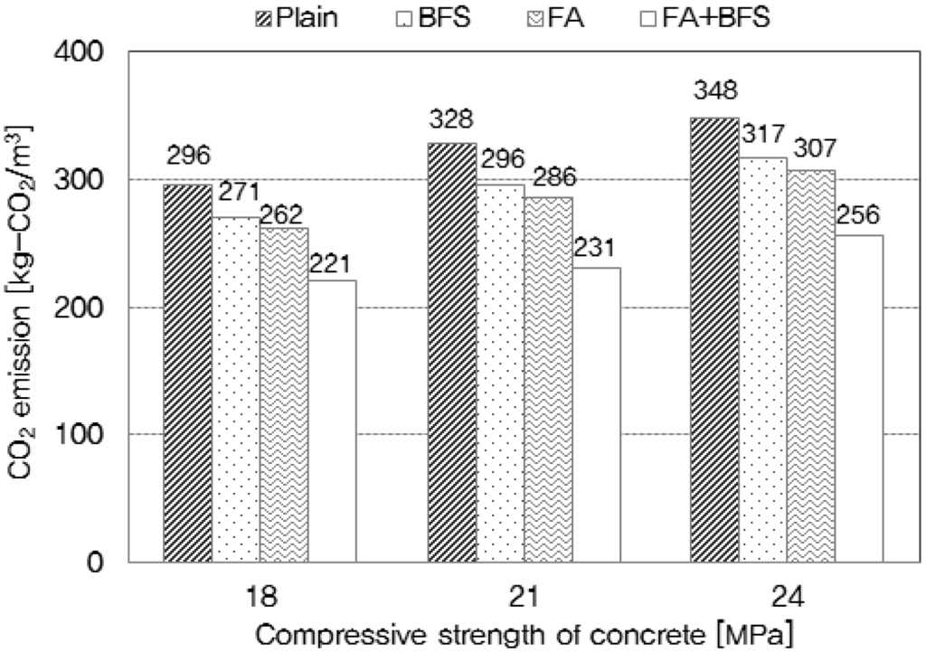 As shown in Figure 4, when the mix types are classified into plain, GGBS mixtures, fly ash mixtures, and GGBS/fly ash mixtures in mix designs with a strength of 24 MPa, the minimum CO2 emissions identified using this procedure are 319 [kg/m3], 295 [kg/m3], 271 [kg/m3], and 254 [kg/m3], and the maximum CO2 emissions are 348 [kg/m3], 317 [kg/m3], 307 [kg/m3], and 282 [kg/m3], respectively. These results therefore establish the maximum and minimum ranges of CO2 emissions based on the mix ratios of the admixtures for a given strength of concrete. This allows the quantity of CO2 emissions to be analyzed for each of the admixtures based on the designs for nominal strengths of 18, 21, and 24 MPa. The mix designs with strengths of 21 and 24 MPa, in which both fly ash and granulated blast-furnace slag are mixed, result in the lowest CO2 emissions for this example. CO2 emissions are reduced by approximately 29% and 26%, respectively, relative to those of the plain mix design that did not include any admixture [17].