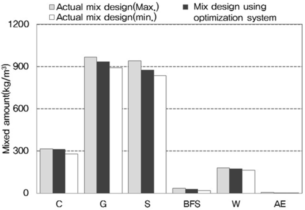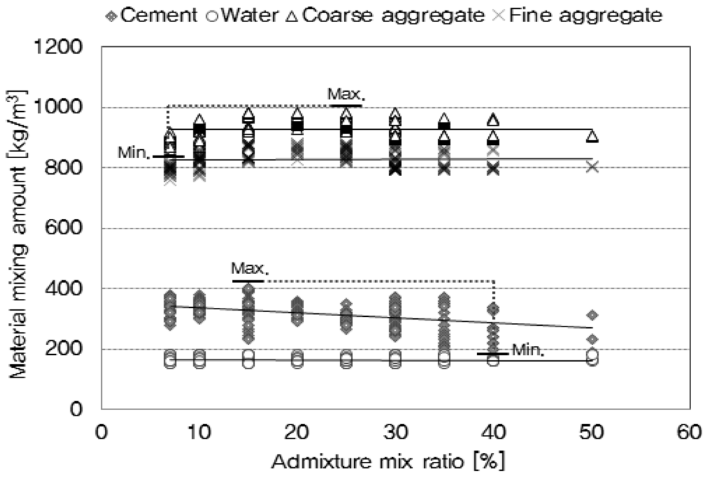 Looking at the admixture mixing ratios identified in the study by Kim et al. [17], the amount of coarse aggregate ranged from a minimum of 865 kg/m3 to a maximum of 997 kg/m3; the amount of fine aggregate ranged from 781 kg/m3 to 982 kg/m3; the amount of cement was between a minimum of 158 kg/m3 and a maximum of 389 kg/m3; and the amount of water was between 105 kg/m3 and 185 kg/m3, as shown in Figure 6. Based on these results, the maximum and minimum mix amounts of cement, aggregate, and water for each mix ratio were established.
