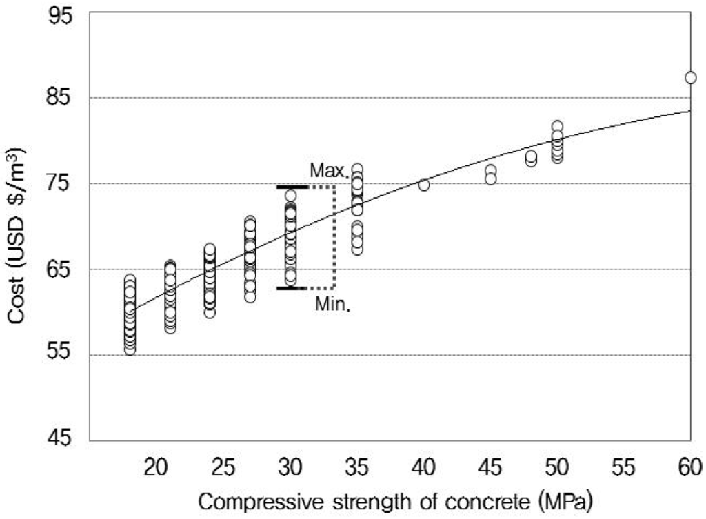The cost analysis performed for the mix design process utilizes information from Korea’s price database to determine the product cost [24]. As shown in Figure 7, the cost of concrete with a strength of 24 MPa ranged between US$59.20 and 70.60/m3 , and that of concrete with a strength of 30 MPa ranged between US$63.20 and 73.70/m3. As a result of this analysis, the maximum and minimum costs as a function of concrete strength were established.