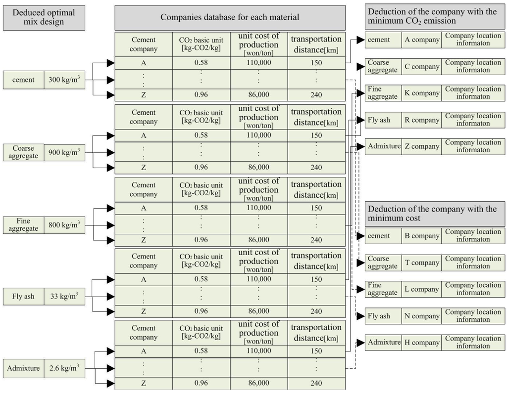 As indicated in Table 4, the location information must be collected for the various plants producing cement, aggregate, and admixtures and transformed into latitude and longitude coordinates. These can then be used to create a database to determine the transportation distance. Within Korea, this location information was collected for 100 cement production plants, 390 aggregate production plants, 15 fly ash production companies, five granulated blast-furnace slag production plants, and 15 chemical admixture production plants. The means of transportation for each component material of concrete was limited to either rail or truck, which were classified into cement freight trains and trucks with capacities of 1, 2.5, 3.5, 5, 8, 15, 18, and 25.5 tons, allowing the number of transportation vehicles for each material to be calculated on the basis of the total quantity (kg) of each component material of the concrete and the capacity (in tons) of the various transport options. The number of transportation vehicles was used to evaluate CO2 emissions and costs by applying the transportation distance, basic unit of CO2 emissions, and fuel cost [29,30,31,32]. Figure 9 depicts the optimal support algorithm for concrete.