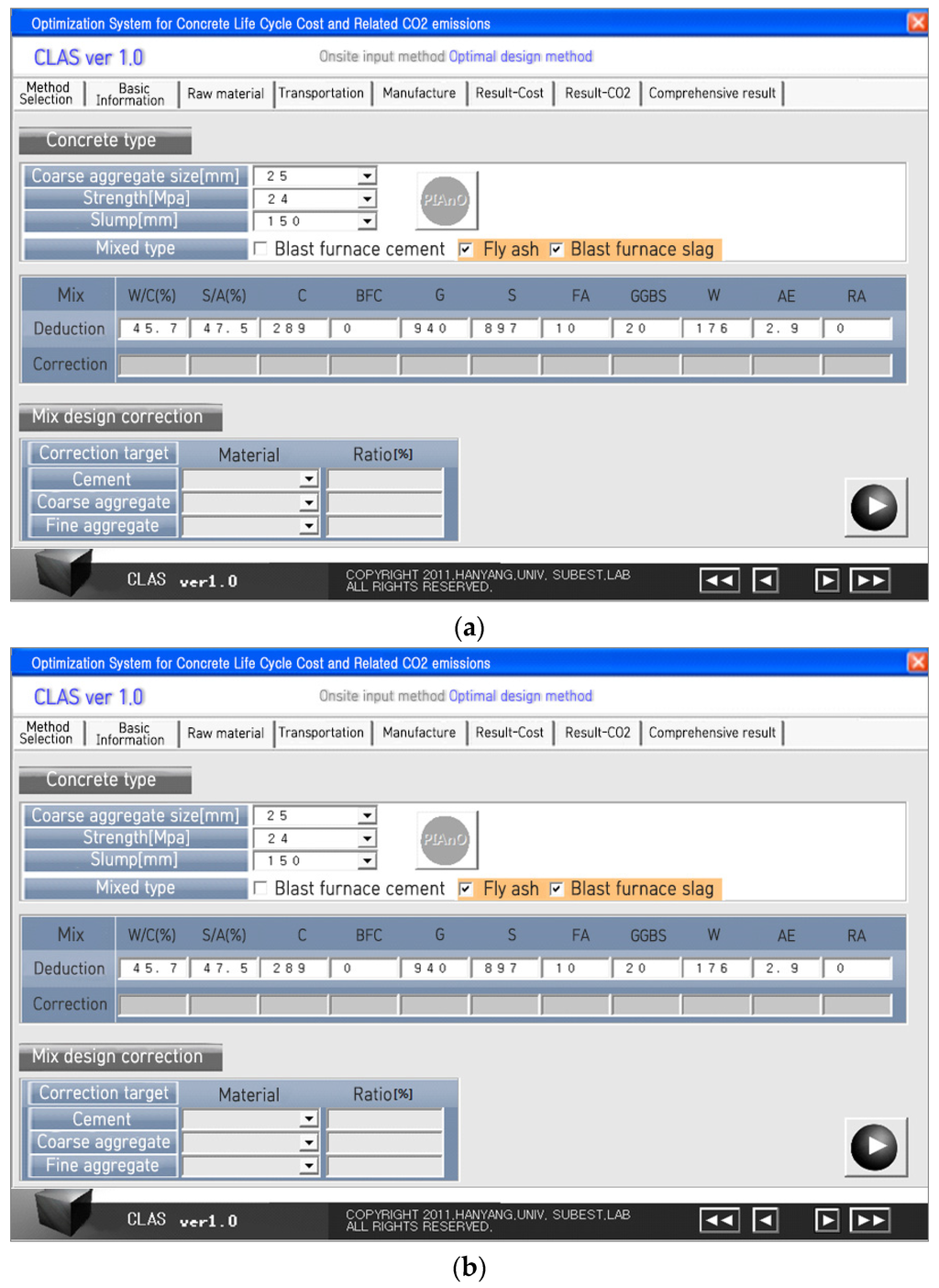 A case analysis was performed for a specific RMC plant in Korea. The results indicated that the CO2 emissions and costs per m3 of RMC were 340.9 kg-CO2/m3 and US$49.70/m3, respectively, using the conventional input method currently used in the industry. Applying the new CLAS program, the CO2 emissions could be reduced by 34% to 225.7 kg-CO2/m3 when minimizing the CO2 emissions was prioritized, and the costs dropped by 1% to US$48.80/m3 when minimizing the cost was prioritized. Based on the case analysis, the most significant way to reduce the CO2 emissions and costs associated with the manufacture of ready mix concrete are to select the mix design and raw material supplier based on whether the CO2 emission or cost are to be minimized.