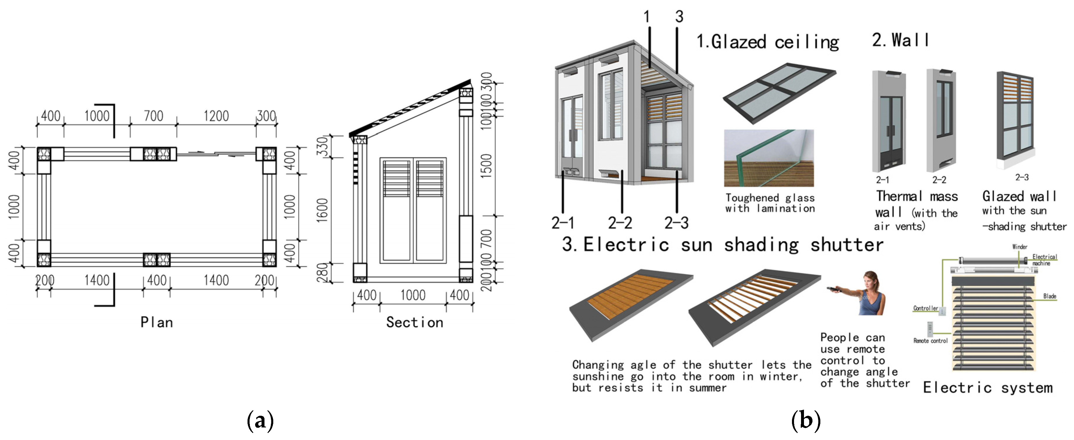 As a method of isolated solar gain, the greenhouse block incorporates a passive heat distribution system that can improve the thermal and acoustic insulating performance of a residential building. The size of block is 1800 mm × 3600 mm, following the construction modulus with a sloping roof that absorbs solar radiant light and heat more efficiently. All the factory-built components of the greenhouse block are prefabricated. The roof panel is comprised of an electric sun-shading shutter and a glazed ceiling. The main external envelope of the greenhouse block has glazed walls with a sun-shading shutter. In addition, the interior has a thermal mass wall with air vents that close or open to adjust the indoor temperature (Figure 1).