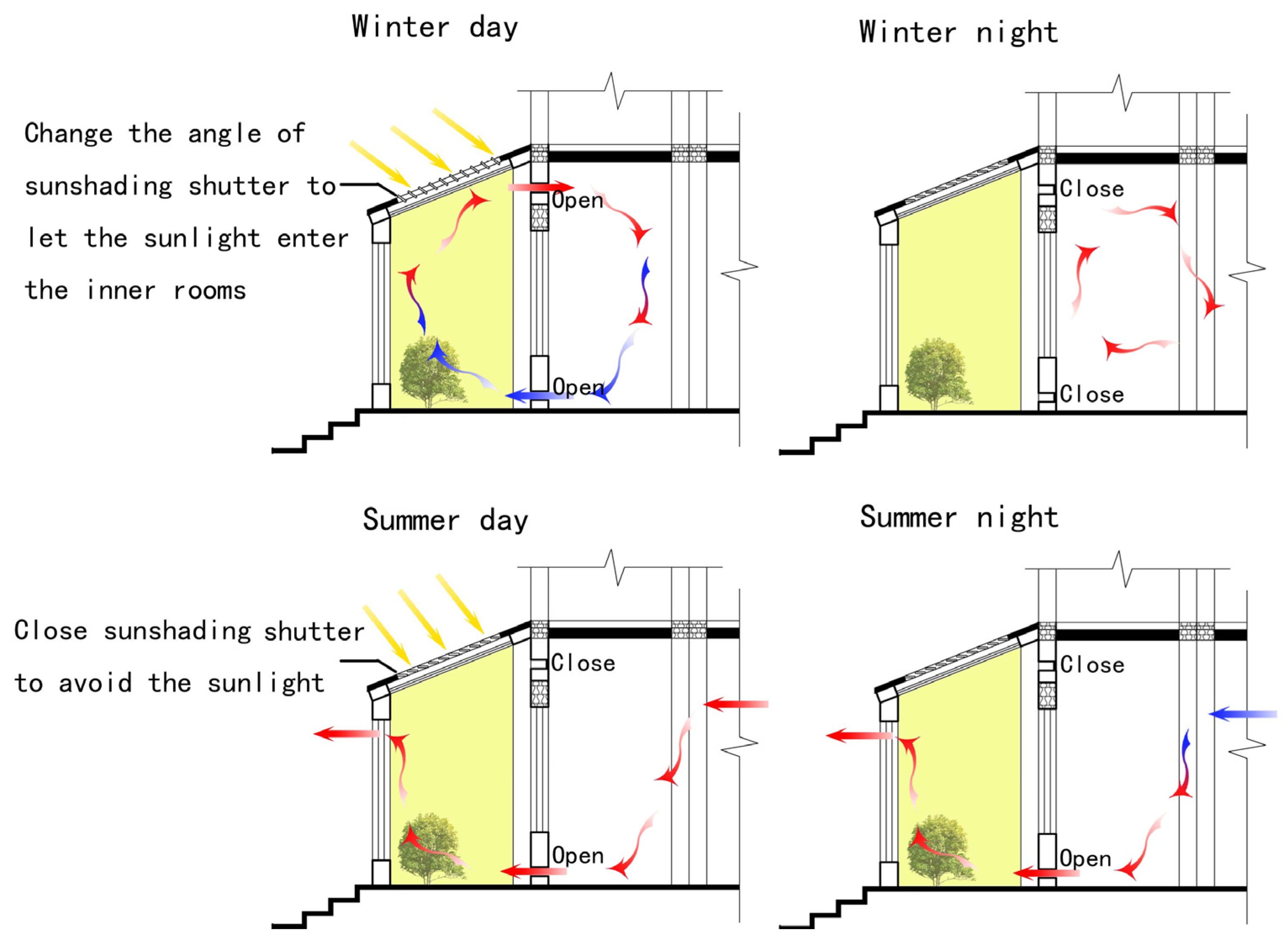The passive solar system is essentially composed of an additional space within a living space. In winter, during the daytime, thermal energy is captured from a south-facing greenhouse block and the heat is circulated by a natural convection flow loop in the cavity between the greenhouse block and the adjacent living block. By contrast, the greenhouse block can be identified as an outstanding insulation or buffer to reduce unwanted heat loss by closing the shading shutter and air vents at night. In summer, the covered electric sun shading devices retrofitted onto the block eliminate all direct solar gain in the daytime, and the down vents are opened to expel hot air by natural convection at night. (Figure 2) Therefore, the greenhouse block is important to achieve thermal comfort for occupants.