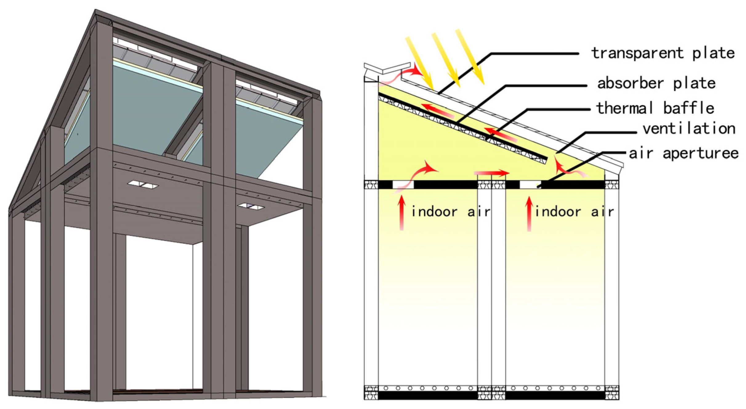 The solar chimney block composed of a vertical shaft connecting the interior and exterior can produce a chimney effect to strengthen natural ventilation during summer by absorption of heat from the sun’s radiation. Warming the solar collector area enclosed by both transparent glazing sloping roof and radiant ceiling panels, the air inside of the main ventilation shaft is heated, causing an updraft that pulls air through the living space, thereby completing the conversion from heat pressing to wind pressure. In winter, the solar chimney block may be converted into thermal insulation for the building by closing the air apertures (Figure 4).