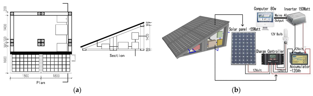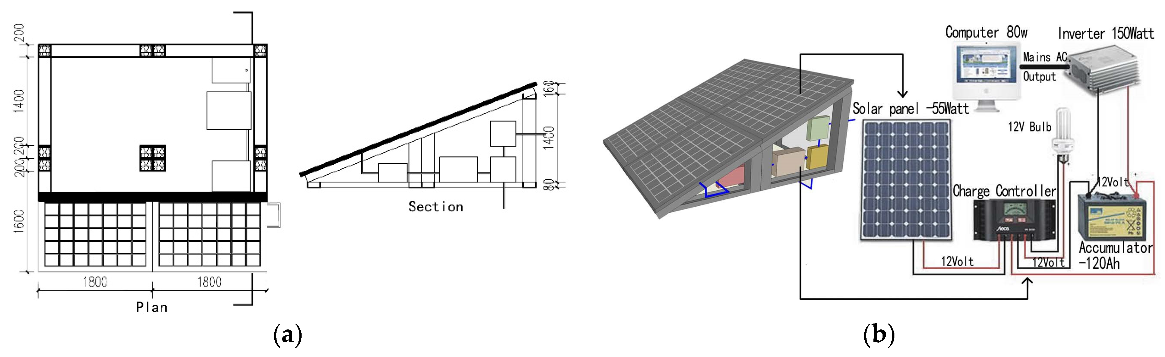 Active solar technology, unlike passive solar heating systems, involves the use of mechanical and electrical devices [35]. The photovoltaic block is a form of active solar energy utilization; using solar energy electro-optical technology, it can convert solar energy to electric energy through the photoelectric effect. The size of the block matches the construction modulus of 1800 mm × 3600 mm. The ensemble of photovoltaic block consists of several components, including roof-integrated solar panels to absorb and convert sunlight into electricity, a solar inverter to change the electric current from Direct Current (DC) to utility frequency Alternating Current (AC), and an accumulator to store excess power (Figure 5).