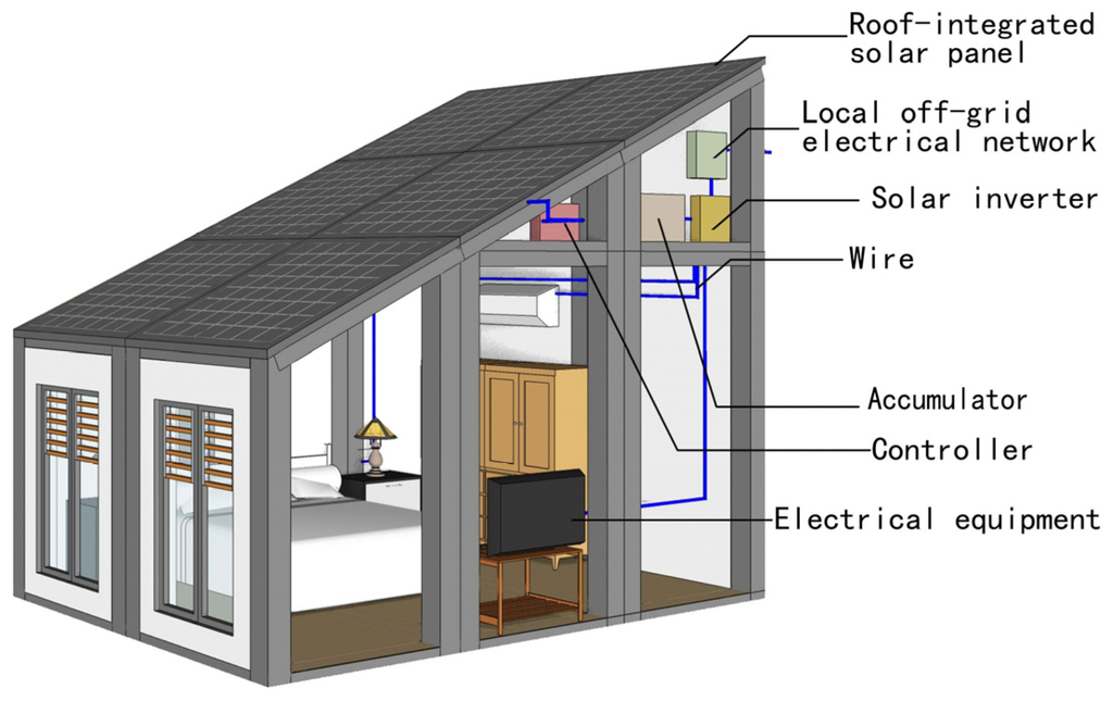 According to the results of an investigation [36], a roof-integrated photovoltaic block should have a slope of 35° and be directed south or east, based on the latitude of most western regions. The solar inverter, ensconced in the layer between the roof and the ceiling, is designed to be compatible with both grid-connected and off-grid residences, as the excess AC electricity can be fed into a commercial electrical grid or used by a local off-grid electrical network (Figure 6).