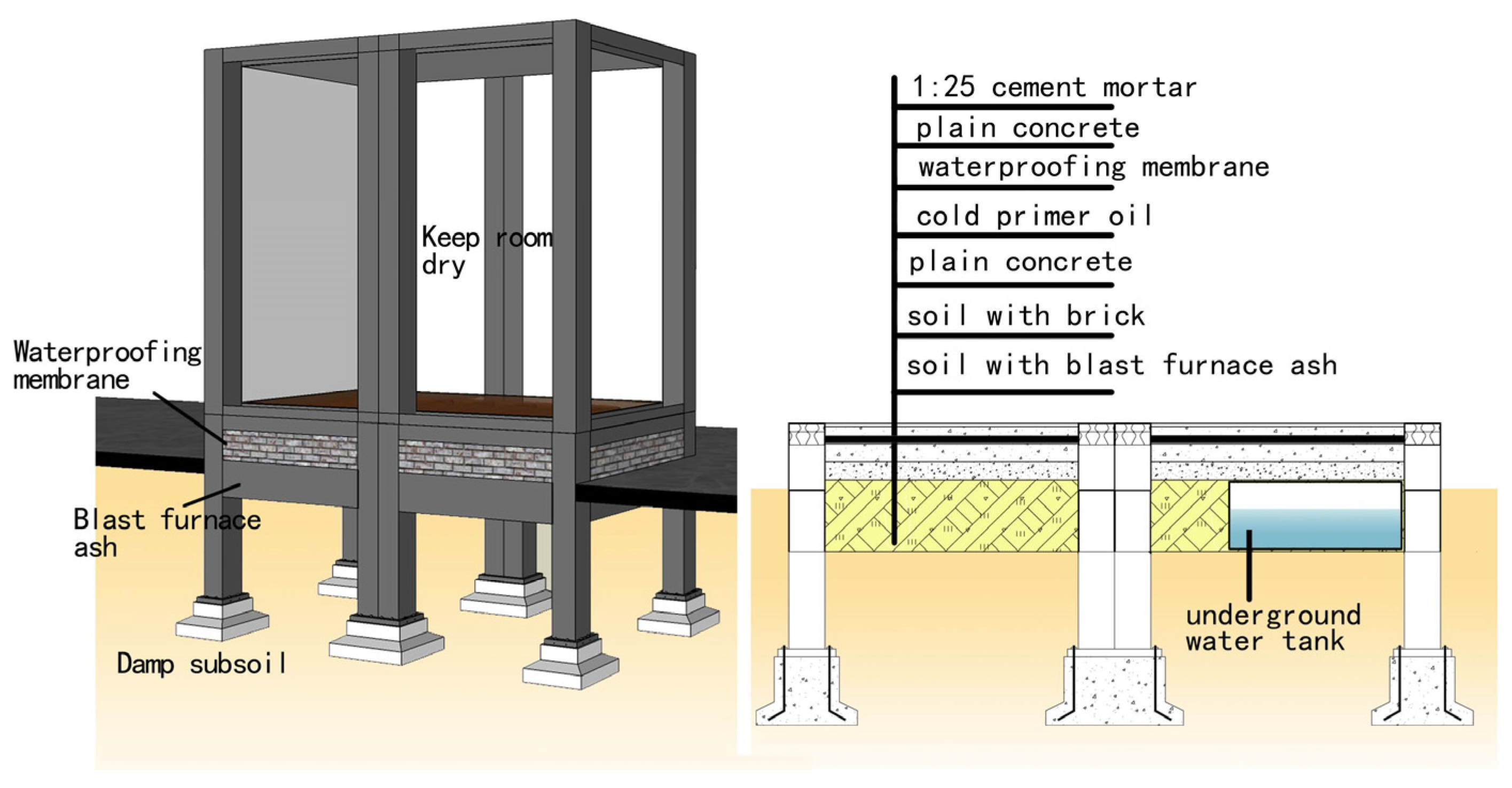 Waste recycled materials make a foundation block with underground water tanks, which is the fundamental element of the block-based construction: it connects to the ground and transfers loads from the structure to the ground (Figure 11). At the bottom of the foundation, the soil contains blast furnace ash, which is a byproduct of steel and can be used as anti-freeze soil padding. To keep the above-ground living space comfortable, the foundation block with waterproofing membrane can prevent dampness from seeping through the subsoil. The underground water tank is maintained by adequate rain flow captured by an area of the above-ground block’s large sloping roof.