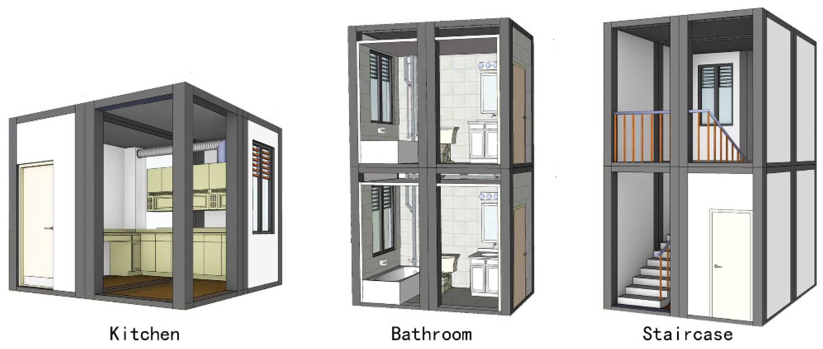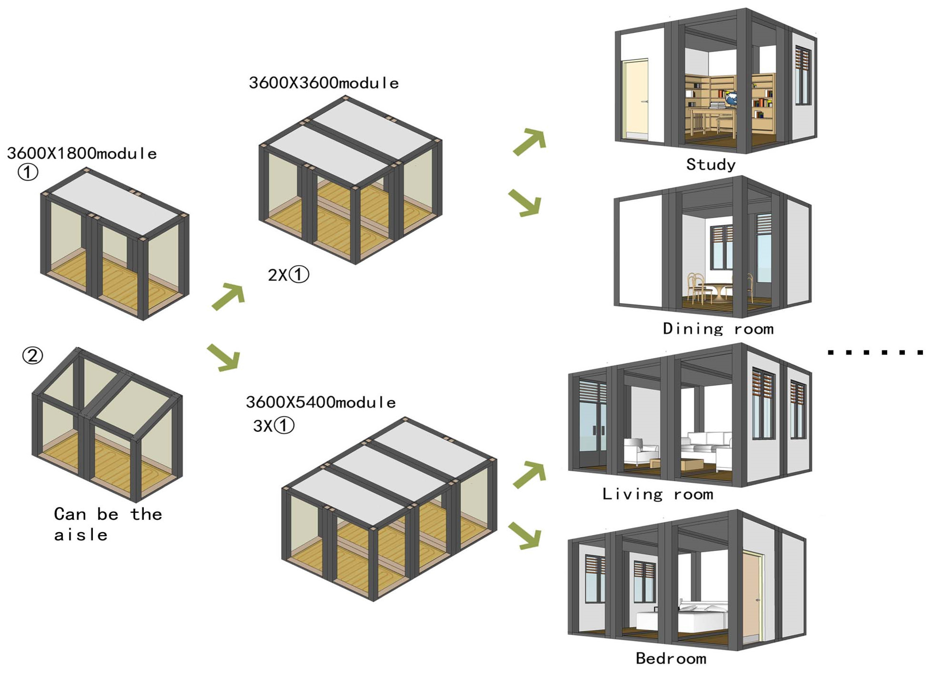 The basic room block can be assembled flexibly to create rooms with different sizes and functions. The construction modulus 1800 mm × 3600 mm of the basic block is convenient and seamless to connect with other blocks or itself. For instance, two basic blocks assembled with the size of 3600 mm × 3600 mm can be a study or dining room, and three basic blocks can be assembled as the living room or bedroom with a size of 3600 mm × 5400 mm (Figure 13).
