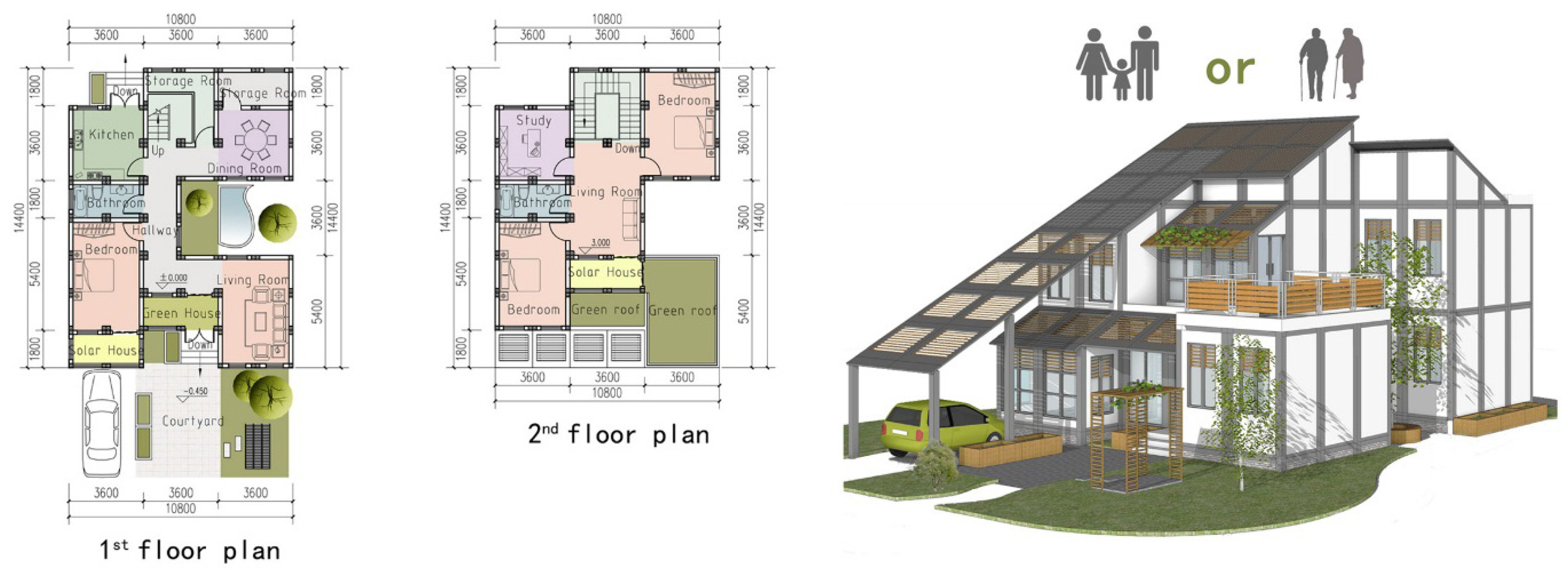 The solar energy category subdivides into the passive solar energy subcategory (greenhouse block, solar chimney block) and the active solar energy subcategory (photovoltaic block, solar heating block) with maturing solar energy facilities and technology on its sloping roof. According to the concepts of energy efficiency, resource conservation, and environmental protection, sustainable technologies have been utilized in the green technology category, including installing a planting roof block that integrates the rainwater harvesting system and a foundation block that uses the waste recycled materials and installs the water tank underground. Standard blocks act as the basic living spaces and functions for the rural residence such as kitchen, bathroom, staircase, and living room. Each block in the system with a floor heating system matches the construction module of 1800 mm × 3600 mm and thus provides high adaptability, expansibility, and flexibility to assemble various types of rural houses, tailored to residents’ wishes.