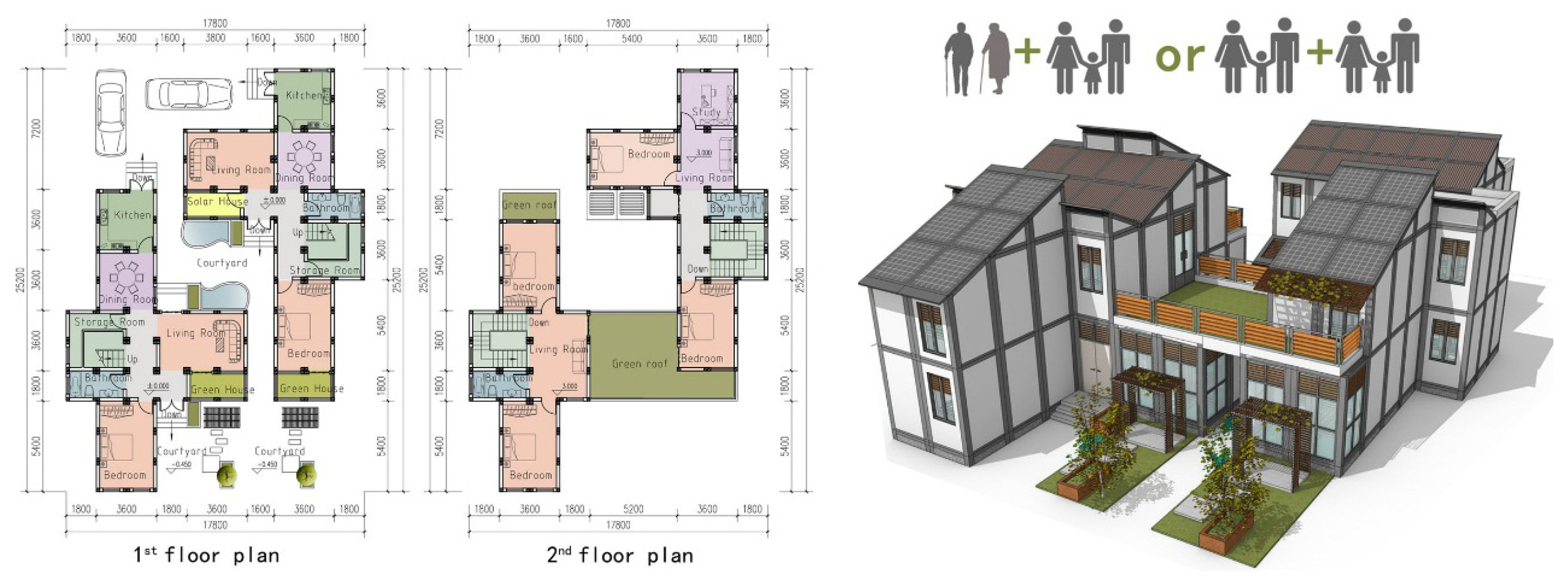 Scheme two is a detached house with two shared courtyards and one shared balcony that it is suitable for three generations under one roof or two related families (Figure 16). The two families can share one courtyard. It is assembled from: