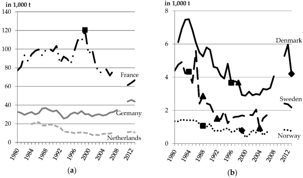 Sold active substances (1000 t) in selected European countries: (a) France, Germany, and the Netherlands; (b) Denmark, Sweden, and Norway. A “■” symbolizes the introduction of a pesticide tax, a “▲” symbolizes a tax increase, and a “♦” a change of the tax scheme. Please note the different scales in the diagrams. Gaps in 2009 and 2010 are due to methodological changes in data collection. For Germany, until 1991, data are for West Germany. For Norway, until 1990, data are estimated according to []. Data reference: []. The data is provided in a supplementary file.