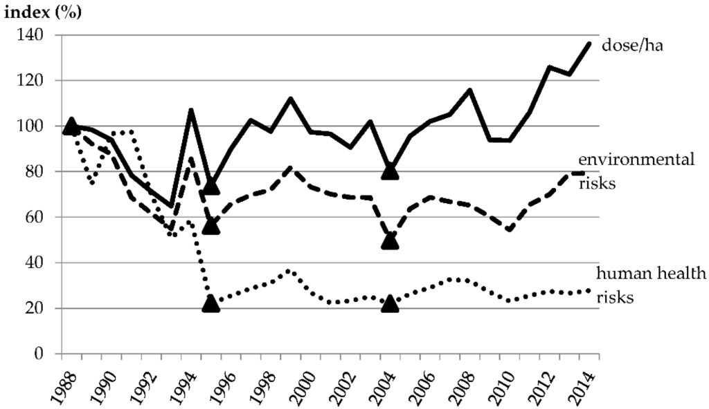 Development of Swedish pesticide risk indicator with respect to environmental and human health risks. In addition, the average dose/ha is shown as an index. The pesticide risk indicator is indexed to the year 1988 (index value of 100). The “▲” symbolizes a tax increase. Data reference: []. The data is provided in a supplementary file.