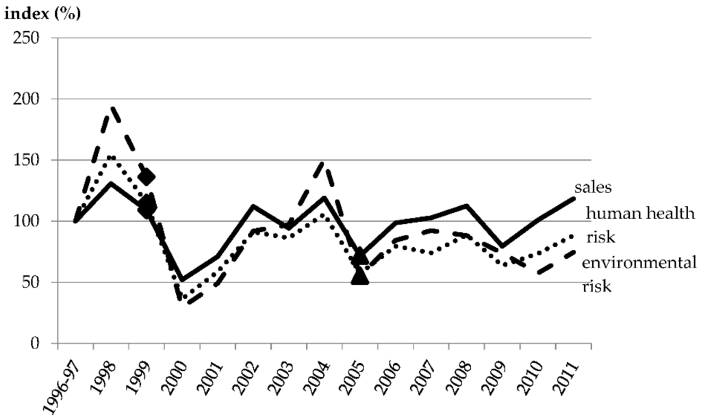 Development of the Norwegian pesticide risk indicator with respect to environmental and human health risks as well as total annual sales based on retailers’ sales data. The average of 1996 and 1997 is used as index base (index value of 100). A “♦”symbolizes a change of the tax scheme and a “▲” a tax increase. Data reference: Statistics Norway and the Norwegian Food Safety Authority []. The data is provided in a supplementary file.