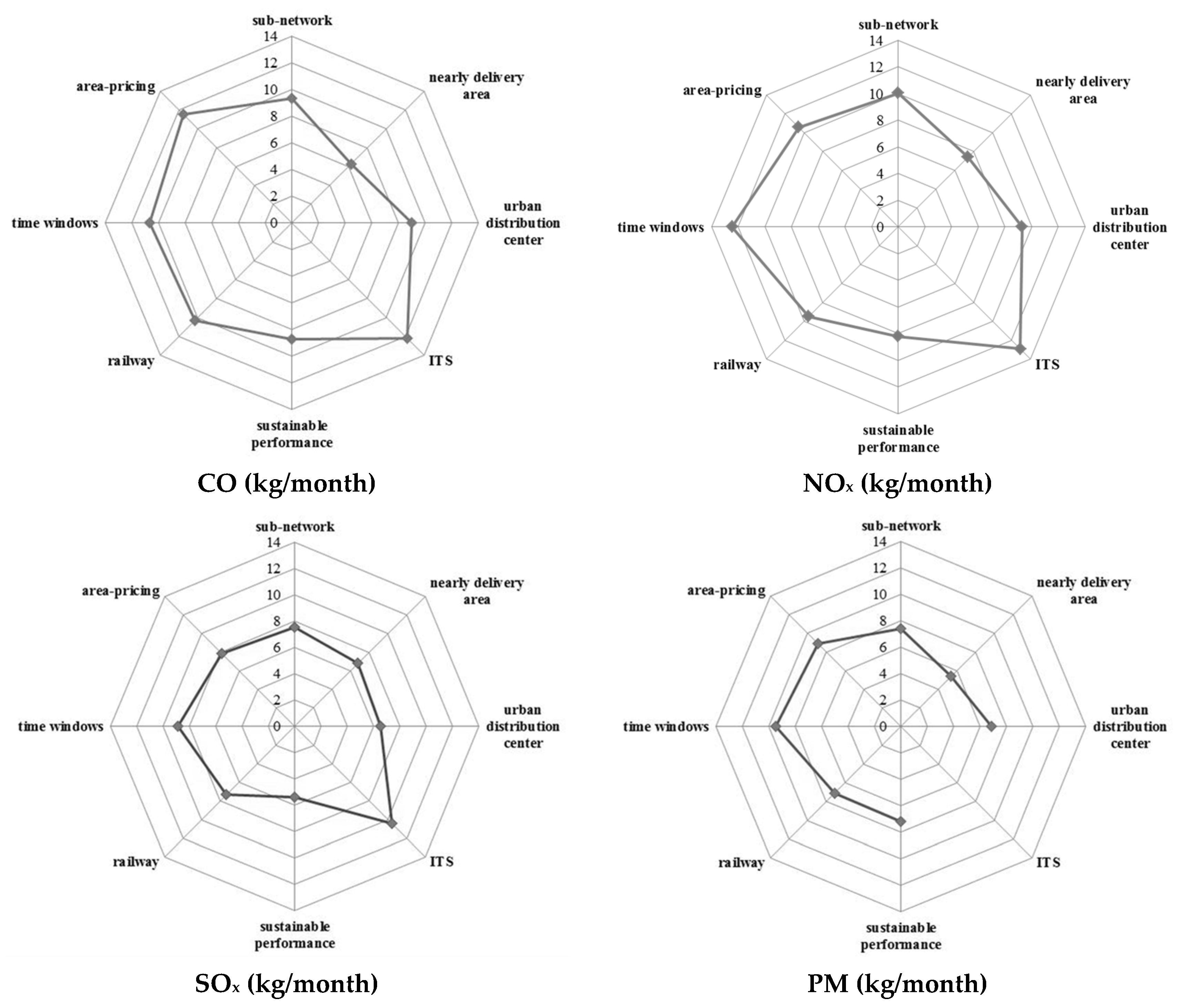 According to the classification chosen above, the monthly reduction in pollutants was investigated for the following set of aggregate measures: material infrastructures (i.e., sub-network, urban distribution center and nearby delivery area), non-material infrastructures (i.e., intelligent transportation system), equipment (i.e., sustainable performance and railway), and governance (i.e., time windows and area-pricing).