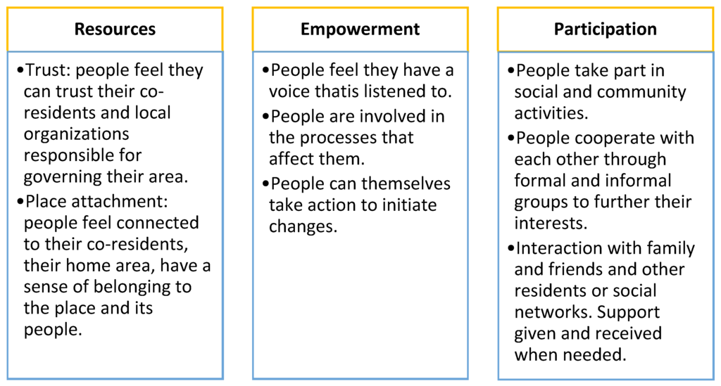 Finally, participation in this study refers to people’s involvement in formal and informal [] networks []. Participation is seen as a factor that can enable and facilitate sustainability []. The premise is that if people participate [], they will have a stronger connection with the community [].