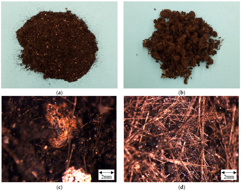 The cement used in this study was Type I ordinary Portland cement (ASTM C150) with specific gravity of 3.15. The fine aggregate used was sand passing the sieve no. 4 (4.75 mm) with a fineness modulus of 2.36. The specific gravity and water absorption are 2.66 and 2%, respectively. Figure 2a,b shows the pictures of ground RAS and cellulose fibers extracted from RAS, respectively. Figure 2c,d shows those aggregate and fibers in larger magnifications. As seen in Figure 2, RAS has shown irregular shape, rough surface texture and highly angular particles [34]. In general the RAS is composed by 40% to 70% of aggregate granules, 20% to 40% of asphalt, and 1% to 25% of fibrous base materials (which can be either cellulose or glass fibers) [18,19].