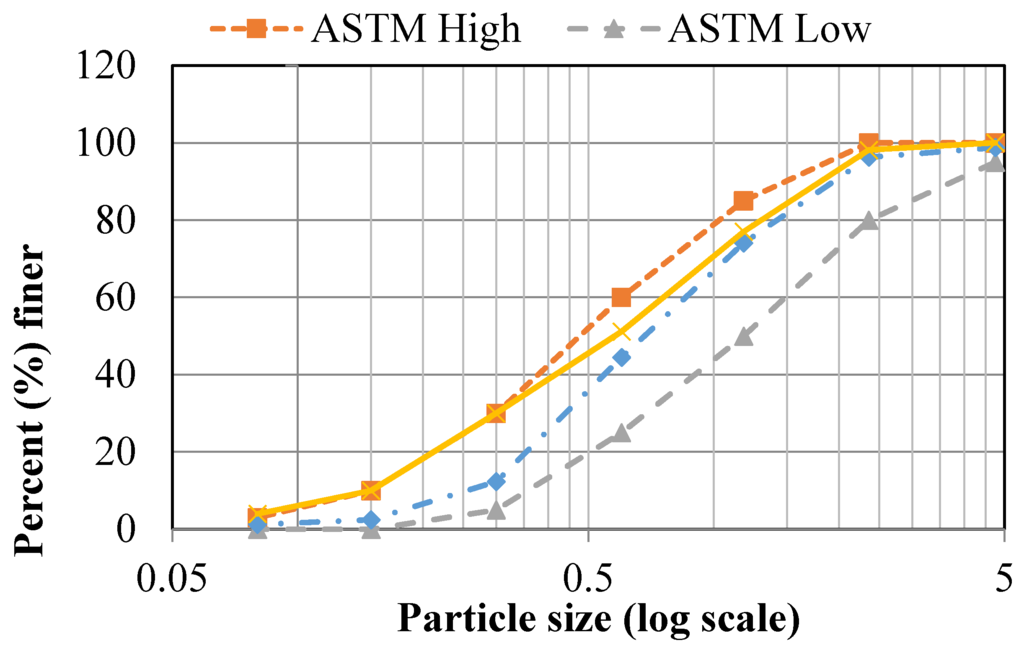Fine aggregate and RAS used in this study meets the grading requirement of ASTM C33. Figure 3 shows the particle size distributions of fine aggregate with the corresponding ASTM C33 grading requirements and also the gradation of ground RAS used in this study. The aggregate granules used in RAS is likely crushed rock particles coated with ceramic oxides, ground coal slag, backsurfacer sand, or mineral filler [34]. Based on the sieve analysis, RAS has slightly more fine aggregates than typical fine aggregate (see Figure 3).