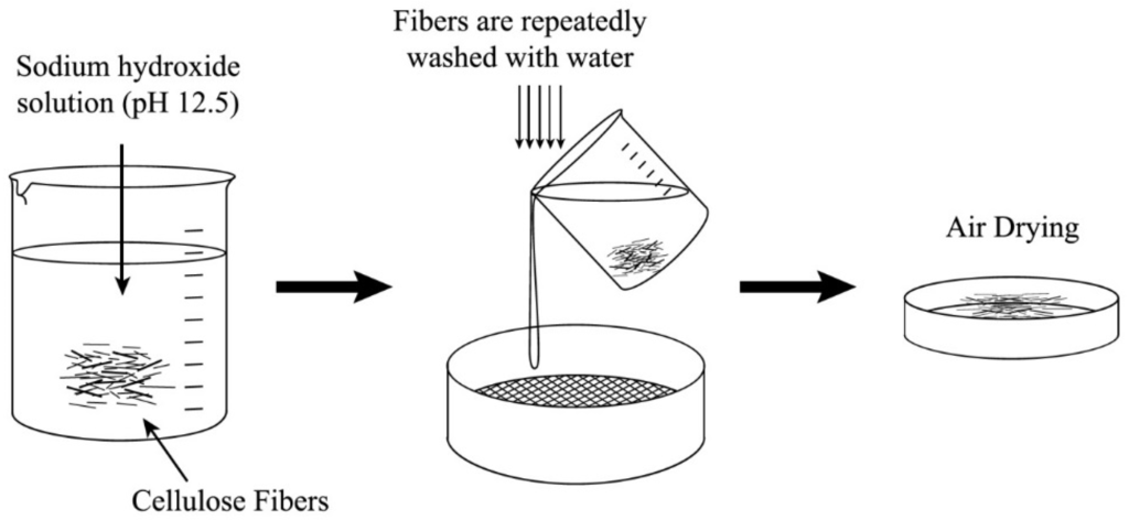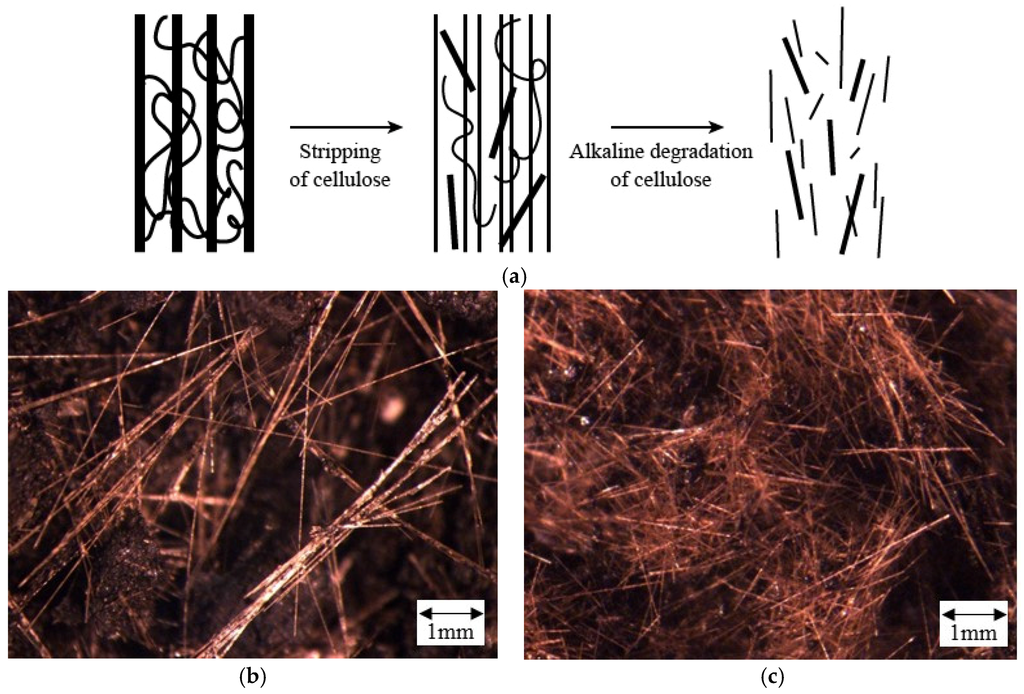 Illustration of degradation process of cellulose fiber in high alkaline: (a) and photos of cellulose fibers before; (b) and after; (c) exposed to high alkaline solution for 3 days.
