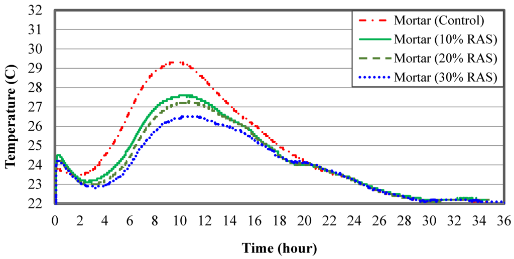 Several testing methods were employed to investigate properties of early cement hydration when RAS was used in replacement of fine aggregate. The selected tests include measurements of heat of hydration (ASTM C186 [37]), setting time (ASTM C807 [38]) and Porosity (ASTM C1754 [39]). A thermometer with four-channel data logger provided by Omega was used to measure heat of hydration. Vicat consistency apparatus of Humboldt Mfg. Co. was used to measure the initial setting time of mortar mixture. All results were compared with a control sample that includes 0% RAS (mortar with only Portland cement and sand).