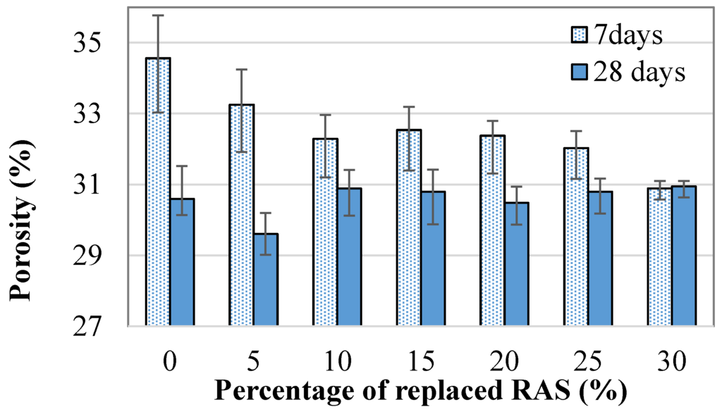 The results of porosity testing are shown in Figure 7. Since Portland cement hydrates and consumes unbound water in the mixture over time, the voids due to unbound water in the mixture is being reduced in process of time. Figure 7 shows that all the results of porosity measurements at 28 days are lower than those measured at 7 days. Interestingly, the control and 5% replacement shows relatively high porosity values at 7 days and significant reduction in porosity at 28 days. Other mortar samples including RAS more than 5% shows smaller reduction in porosity as cement hydration proceeds from 7 days to 28 days. The 30% replacement exhibits almost same porosity between 7 days and 28 days. This can be explained by that the mortar including RAS less than 5% produces significant amount of cement hydration but higher amount of RAS has limited level of cement hydration. Another observation is that the mortar containing 5% RAS at 28 days has the lowest porosity, which is 29.6%. It is an important note that the mortar containing 5% RAS produces the highest compressive strength. As discussed in Section 3.3, the RAS used in this study contains finer particles than sand. As a result, a filler effect likely occurred and led to lower porosity at 5% RAS at 28 days, resulting in the highest compressive strength at 5% RAS (see Figure 6a).