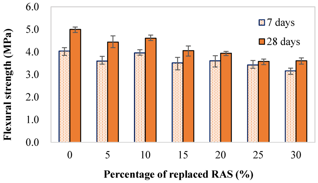 Figure 8 presents the results of flexural strength test. The trend of strength reduction in flexural strength is similar to the results of compressive strength test. This reduction can be explained by the aggregate coated by asphalt film and material degradation of cellulose fibers. In general, the bonding between asphalt film and cement paste matrix is weaker than the bonding between regular aggregate and cement paste matrix [11]. Cellulose fibers are also being degraded under high pH environment. More details of the degradation mechanism are discussed Section 3.6. Although the overall pattern of flexural strength is in decline, the mortar with 10% RAS replacement shows higher flexural strength than the mortar incorporating 5% RAS replacement. One possible explanation of this increment might be the fiber-cement bonding in the mortar. Although there might be a degradation of cellulose fibers due to high pH condition of cement mixture, some of fibers might function as a bridge in the mortar samples. In this sense, it is very recommendable to use RAS with glass fibers as a replacement of fine aggregates. Since glass fiber has more resistibility to high pH condition than cellulose fiber, mortar with RAS containing glass fiber may increase the flexural strength.