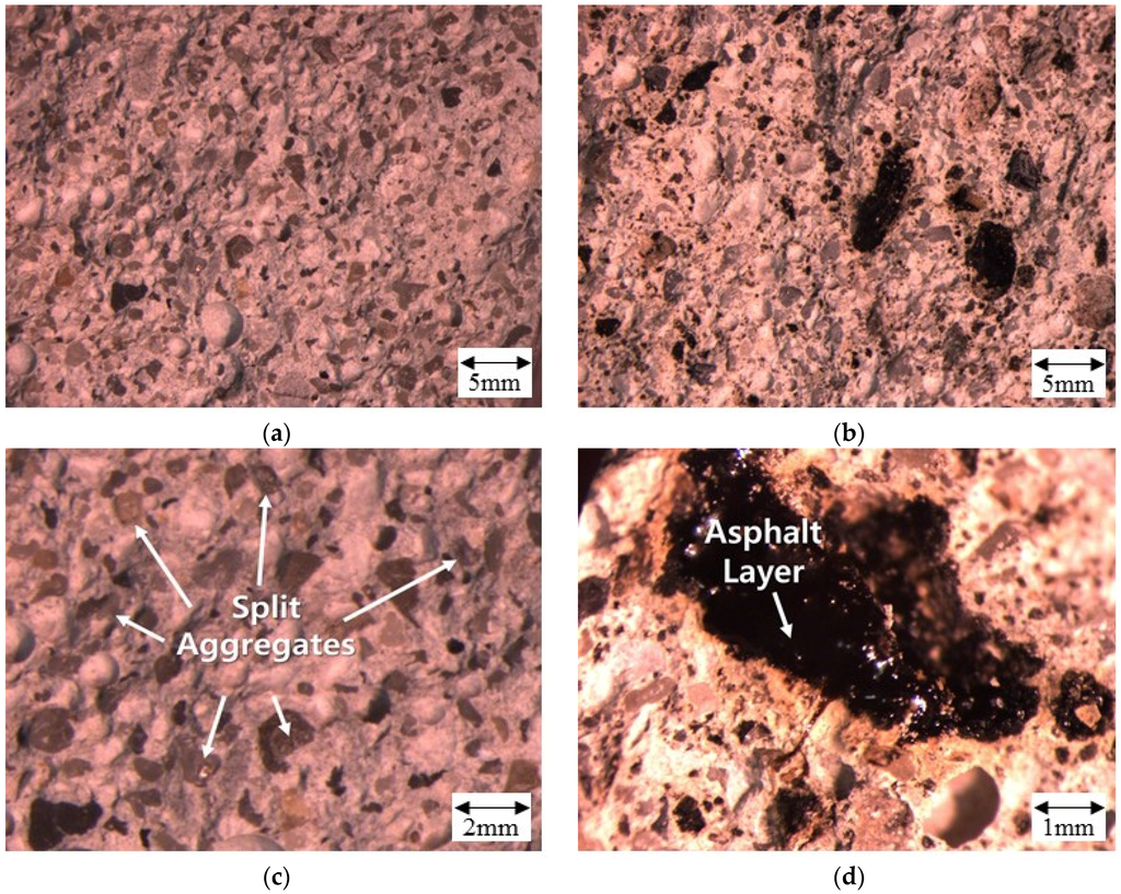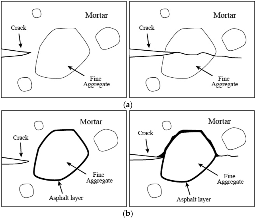 The bonding between asphalt and cement paste matrix is generally weaker than the bonding between regular sand and cement paste matrix [11]. Thus, crack may propagate around the asphalt film surrounding aggregates (shown in Figure 9b) not through the aggregate particle (shown in Figure 9a).