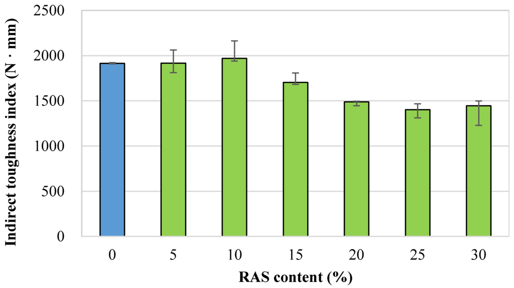 The asphalt film layers, an interface between harden cement paste and RAS aggregate, might impede the crack propagation. While the crack detours around the side of the RAS aggregate due to the asphalt layer, the fracture energy to mobilize crack initiation and propagation might increase. In order to check this mechanism, the toughness of mortar samples was measured. In this study, the area of force–displacement curve of flexural test at 28 days was used as an indirect toughness index. Figure 11 shows the results of indirect toughness index from flexural testing at 28 days. It was found that the mortar samples containing 5% and 10% RAS have larger areas compared to that of the control sample, which indicates that the asphalt film layer requires larger energy to fracture the specimen and also more ductile behavior. Although all mortar samples containing RAS shows lower flexural strength than the control, the mortar samples containing 10% RAS exhibited the highest “toughness”.