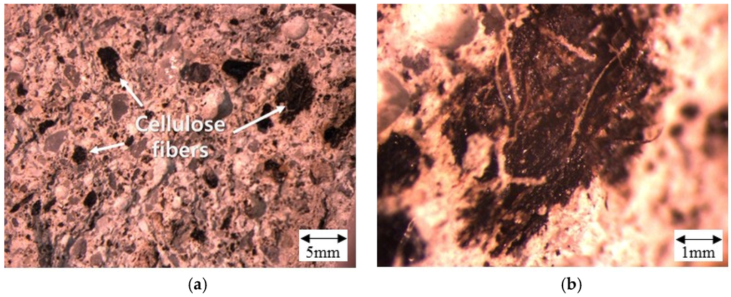 Several researchers report that cellulose fiber provides adequate strength, toughness and the capacity of bonding to cement-based materials because the fibers function as bridge between the cement matrix cracks and transfer the stresses [26,27,28]. Regarding fibers, fibers might be responsible for the reduction of plastic cracking shrinkage and for some increments on mechanical properties of the cementitious mechanical properties [26]. However, the usage of cellulose fiber in cement-based composites is still limited by durability issue of cellulose fibers. The main problems of cellulose fiber are volume variation due to high water absorption capacity and degradation of cellulose fiber under high alkaline environment [29,30,31,32].