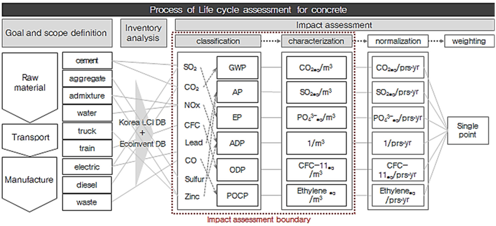 Analysis of Environmental Impact for Concrete Using LCA by Varying the Recycling Components, the Compressive Strength and the Admixture Material Mixing