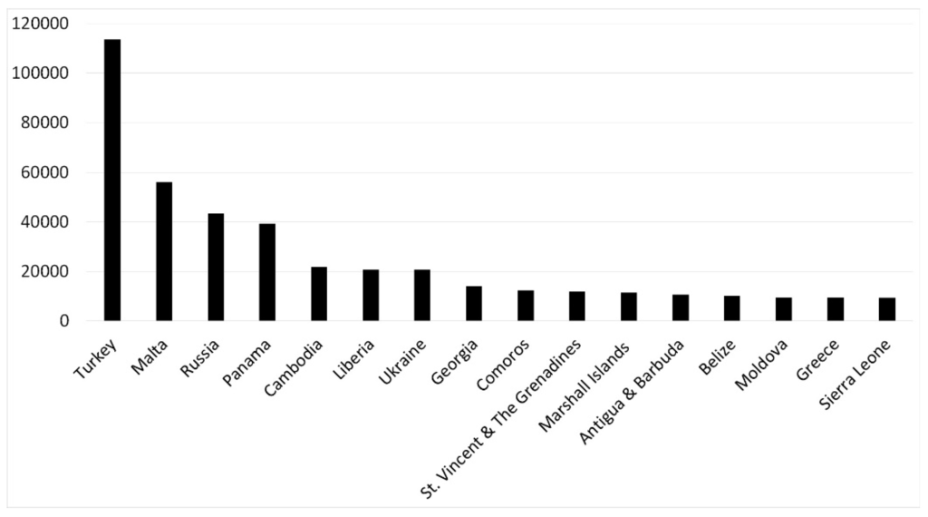 The 16 flag states with the highest number of ships passing through the Istanbul Strait for the period of 2005–2014 are given in Figure 1. The four flags states with the highest total number of ships passing through the Strait are Turkey, Malta, Russia, and Panama, respectively.