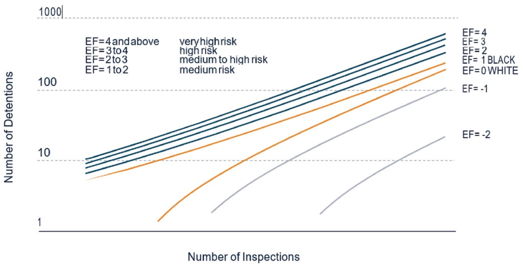 The BGW list is divided into three levels by EF value (EF ≤ 0 is the white list, EF ≥1 is the black list, and 0 > EF > 1 the grey list). Additionally, the black list has been divided into four risk levels—VHR, HR, M to HR, and MR according to EF value. The relationship between the number of inspections and detentions is illustrated graphically in Figure 2.