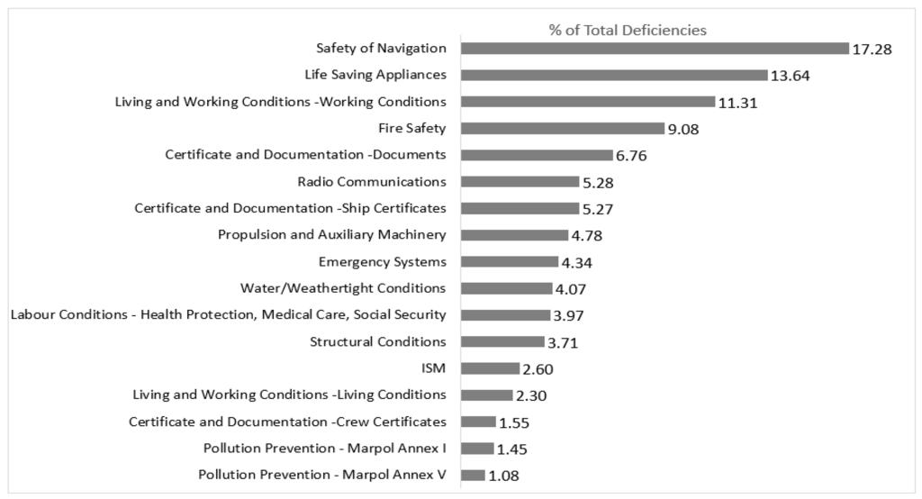 The percentage of deficiencies by categories over the period of 2012–2014 are shown in Figure 3. This shows that navigation safety, lifesaving appliances, working conditions, and fire safety measures are the top four categories in terms of deficiency.