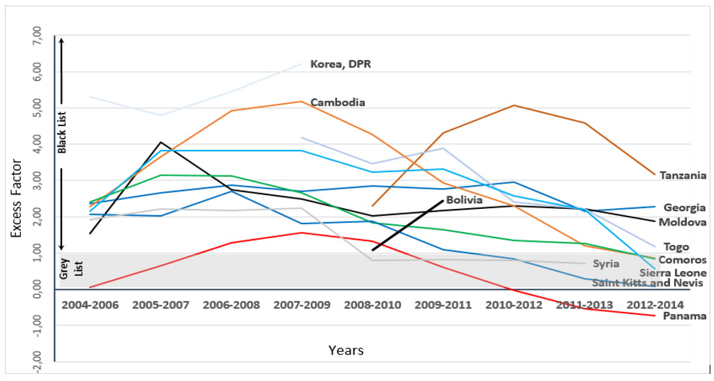 The change in excess factor flag states listed in the black list over time are shown in Figure 4. The DPR of Korea, the Comoros, Georgia, Cambodia, Sierra Leone, Saint Kitts and Nevis, Syria, and Moldova were in the black list in 2006 (covering the years 2004–2006). In 2008 Panama was in the black list, as was Togo in 2009. The DPR of Korea was removed from the BGW list after 2009 due to a decrease in the number of inspections of the DPR of Korea-flagged ships in this period (inspections below 30 in the preceding three years related to a decrease in ship numbers calling to regional seaports). Tanzania and Bolivia were in the black list in 2010. Bolivia was removed from the BGW in 2012. Tanzania, Georgia, Moldova, and Togo were still in the black list in 2014. Tanzania has high risk status and Georgia has medium to high risk status, while Moldova and Togo have medium risk status. Other flags have moved to the grey list. The black list risk level has generally decreased over time.