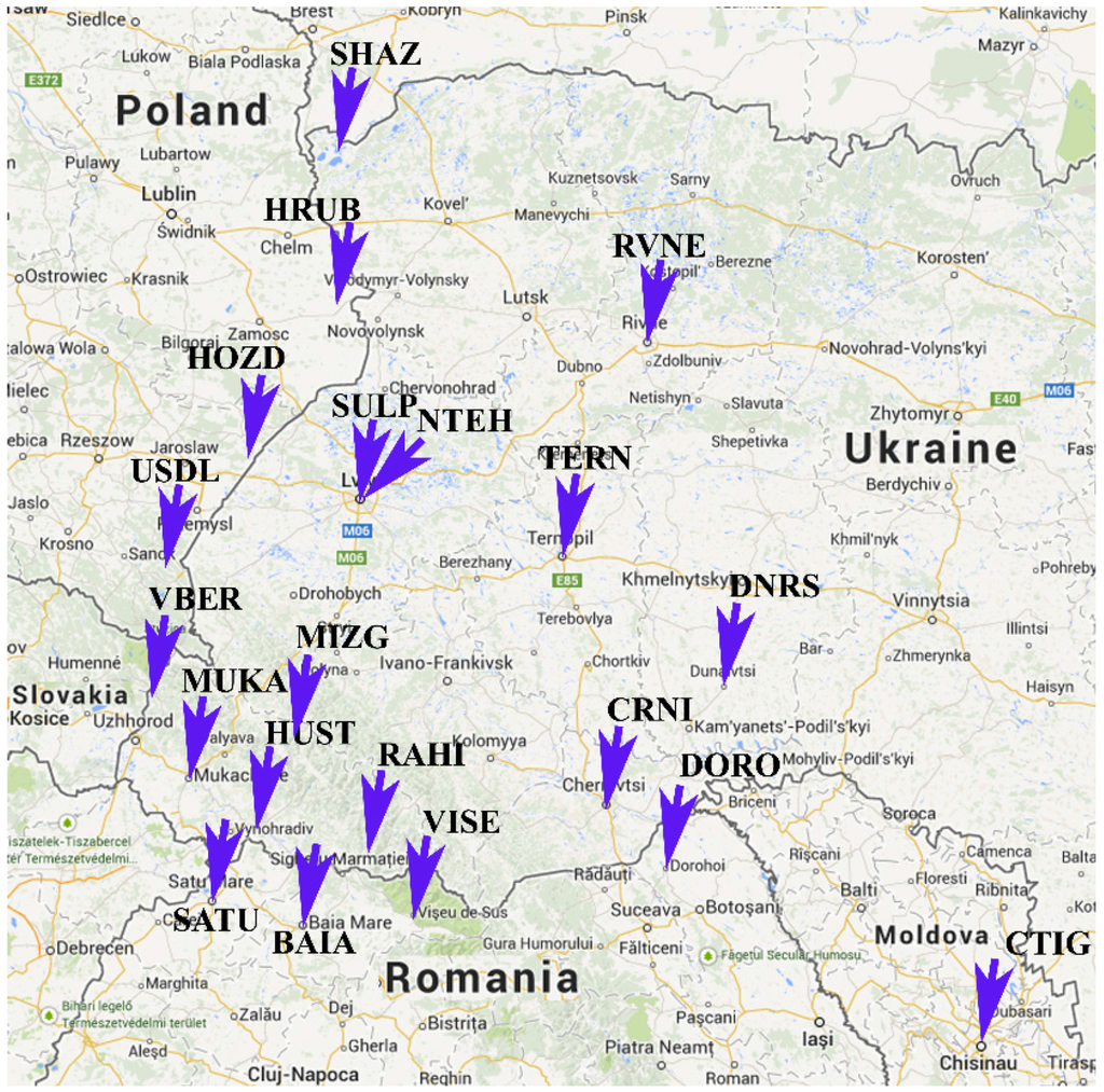 - Savchuk, S.; Kalynych, I.; Prodanets, I. Creation of ZAKPOS active network reference stations for Transcarphathian region of Ukraine. In Proceedings of the International Symposium on Global Navigation Satellite Systems, Space-Based Augmentation Systems and Applications, Berlin, Germany, 11–14 November 2008.