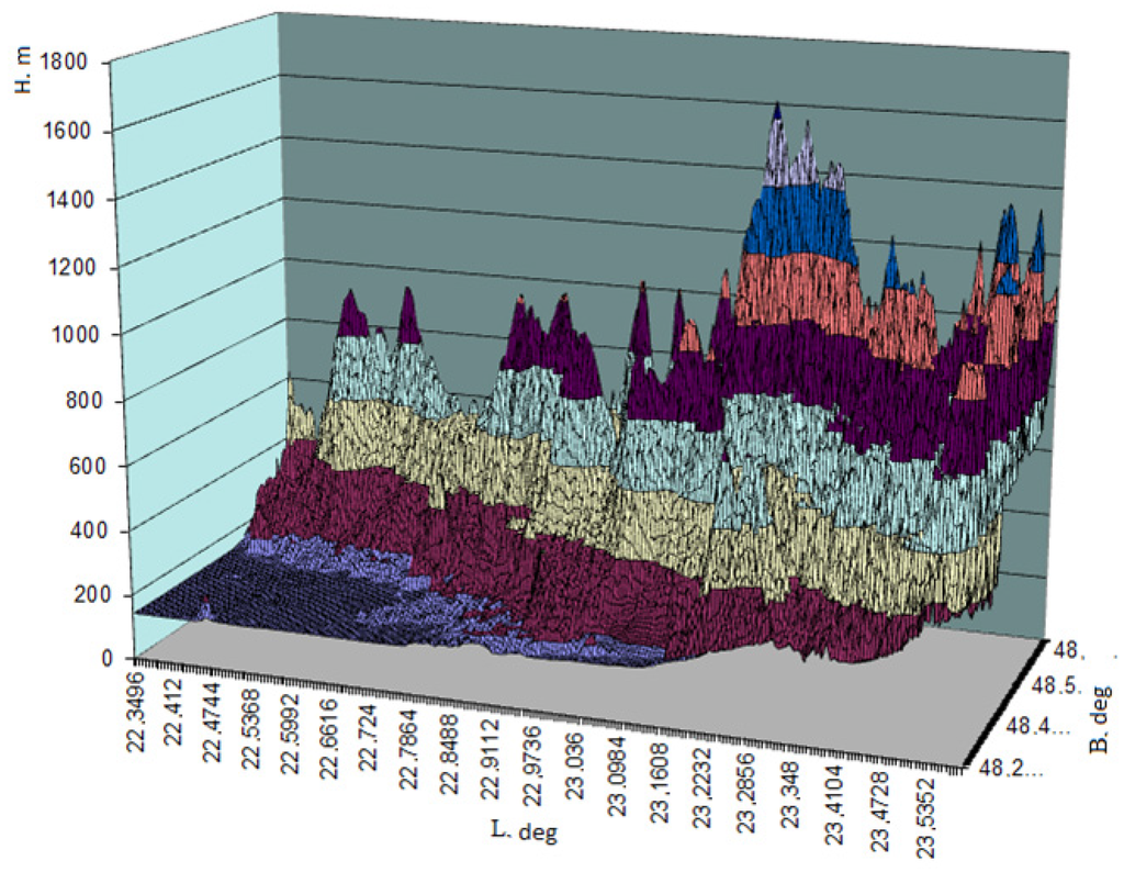One aim of this work is to find tropospheric delays at any point and at any height based on tropospheric delays defined over the active reference GNSS stations of the ZAKPOS/UA-EUPOS network in real time [6]. We have elaborated the method of determination of tropospheric delay in arbitrary point of coverage area of the UA-EUPOS/ZAKPOS network in real time that takes the relief of the region into account. For this purpose, the Transcarpathian region is divided by grid squares of size 250 m × 250 m. The coordinates of more than 200,000 points distanced by 250 m (here, the range of latitude is 47.9°–49.1°, and the range of longitude is 22.1°–24.6°) were obtained.