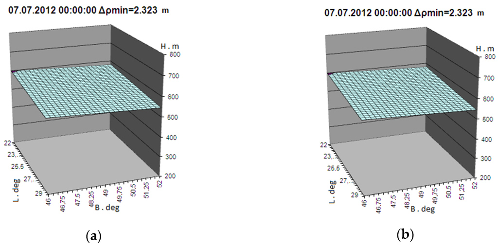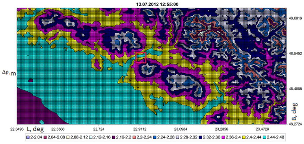 Comparison of the isosurfaces for 7 July 2012, 7 August 2013, 13 July 2013, and 15 July 2012, at the certain instants of time, gives reason to believe that, on 7 July 2012 and 7 August 2013, the situation in the troposphere was stable; thus, over various points of coverage of active reference stations of the UA-EUPOS/ZAKPOS, the isosurface has a height difference that is equal to 58 m and 160 m, respectively. On 13 and 15 July 2013, the troposphere was obviously unstable, and changes in altitudes ( m and m) were extremely large ( is about 670–1000 m).