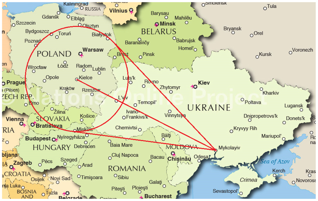 Scheme of signal reception from over-the-horizon FM stations on the route Kielce–Mykolayiv.