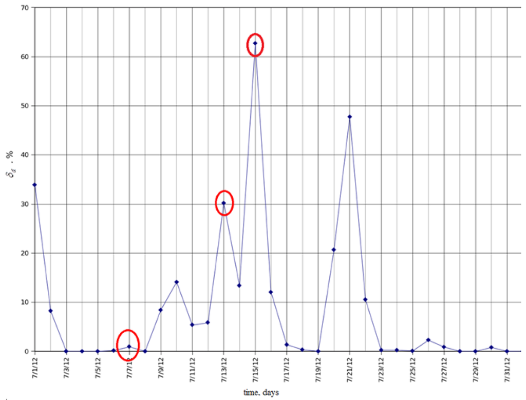 The fragment of tropospheric disturbances during the period from 1 to 31 July 2012 on route Kielce (Poland)—Mykolayiv; is the duration of the observations of the signals of the over-the-horizon FM stations not related with meteor reflections (in % of the time duration).