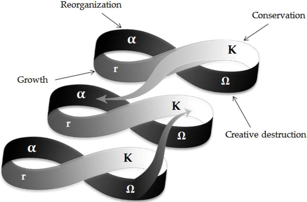 The panarchy model of the adaptive cycle, shown in Figure 1, can explain resilience from an evolutionary perspective [47]. The model, which contrasts a hierarchy, views resilience in terms of a cycle consisting of four phases: rapid growth (r), conservation (Κ), creative destruction (Ω), and reorganization (α). The recovery level varies according to the system’s level of maturation. The point at which creative destruction takes place is also where the opportunity emerges for an alternative regime, which Holling and Gunderson [47] expresses as Ω. To transition into a regime with a greater amount of resilience, the system must produce an adaptive cycle that continually evolves. A great deal of preparation is required for a network to transform a crisis into an opportunity; the degree of preparation can vary according to the system’s ability to imagine a different future.