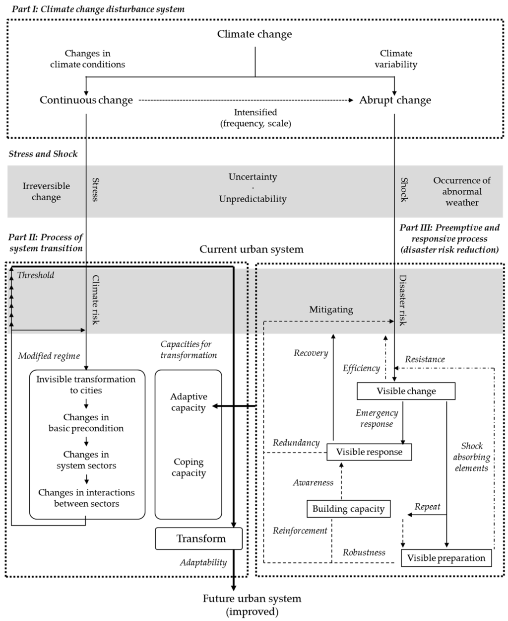 These phenomena inevitably impact city systems. Constant change is understood as stress on a system, whereas abrupt change can be understood as a shock. Stress relentlessly burdens a network and can emerge from both internal and external factors. A shock refers to a sudden and sizeable external perturbation. Current city systems tend to be greatly affected by the stress and shock of climate change. Such impacts are bound to exhibit uncertainties and unpredictability. It is nearly impossible to predict what type of frequency and severity may be expected from such shocks or what types of change and interactions may result from mid- to long-term stress. Climate change stress can be considered in terms of climate risks facing urban systems, and shock resulting from an abrupt change can be analyzed in terms of disaster risk. Climate risk is linked to the second part, which is the process of system change, whereas disaster risk is linked to the third part, which is the preemptive and responsive process, i.e., disaster risk reduction.