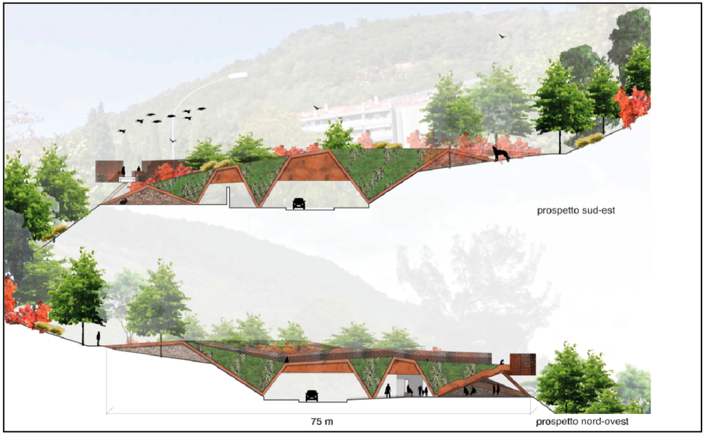The idea of the project stemmed from the choice to separate this space from the infrastructure of the main extra-urban road, by landscaping the terrain, in particular through terracing. The latter in fact intends to accentuate the topography, while serving as a noise and sight barrier.