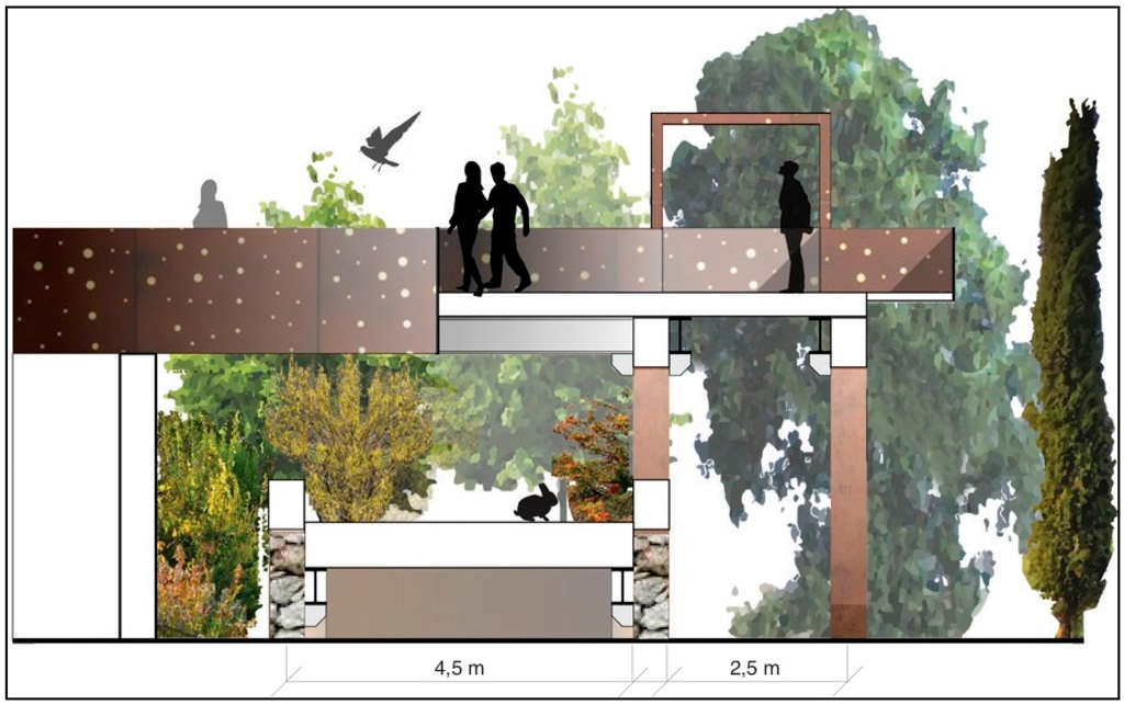 In general terms, besides overcoming infrastructural barriers, an ecoduct is only as effective as the system of precise measures included in both movement corridors. Specifically, in the ecological corridor, it is crucial to identify the different fauna and plant species to integrate into the protected area to be connected, as well as erecting a sufficiently high dividing wall at different levels, physically separating the natural corridors from footpaths, so as to preclude human disturbance to animals. The funnel-shaped design, i.e., greater width at either entrance, rich in native vegetation and suitable refuges, aims to facilitate the entry of animals. The passageways to urban routes are designed to maximize multidirectional anthropogenic accessibility, both externally and within the park area.