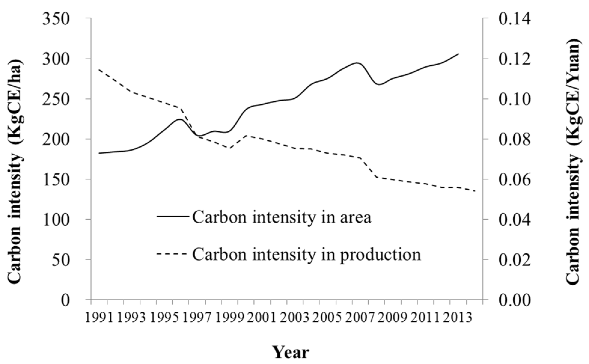 The relative growth rate of agricultural output value was higher than that of total CF in China, which led to the decease in carbon intensity in production from 1991 to 2014. However, the increase in agricultural output value per unit of carbon cost does not outweigh the potential risks induced by the increase in total carbon footprint per unit area of agricultural land. This study is a reminder that the increasing carbon intensity in area may affect the overall success of the series of supporting agricultural policies and sustainable agricultural development in China.
